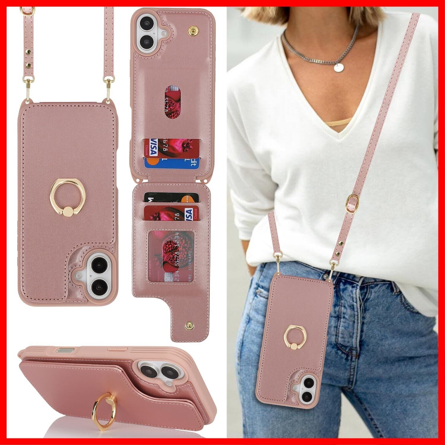 Cavor iPhone 16 手帳型ケースiPhone16 スマホケースショルダー クロスボディ肩掛け 首かけ 斜めがけ ショルダー ケース 背面ポケット付きiPhone 16 財布型ケース【上下開】iPhone16 携帯ケース【RFID機能】iPhone 16 case カード収納 360°回転リング 可愛 横置磁気機能 Qi急速充電対応-ピンク