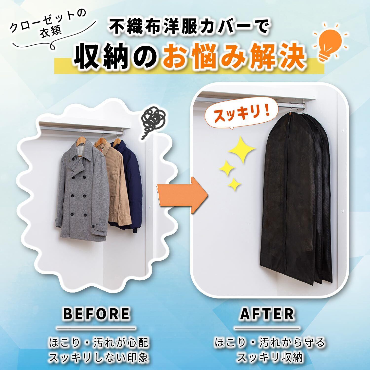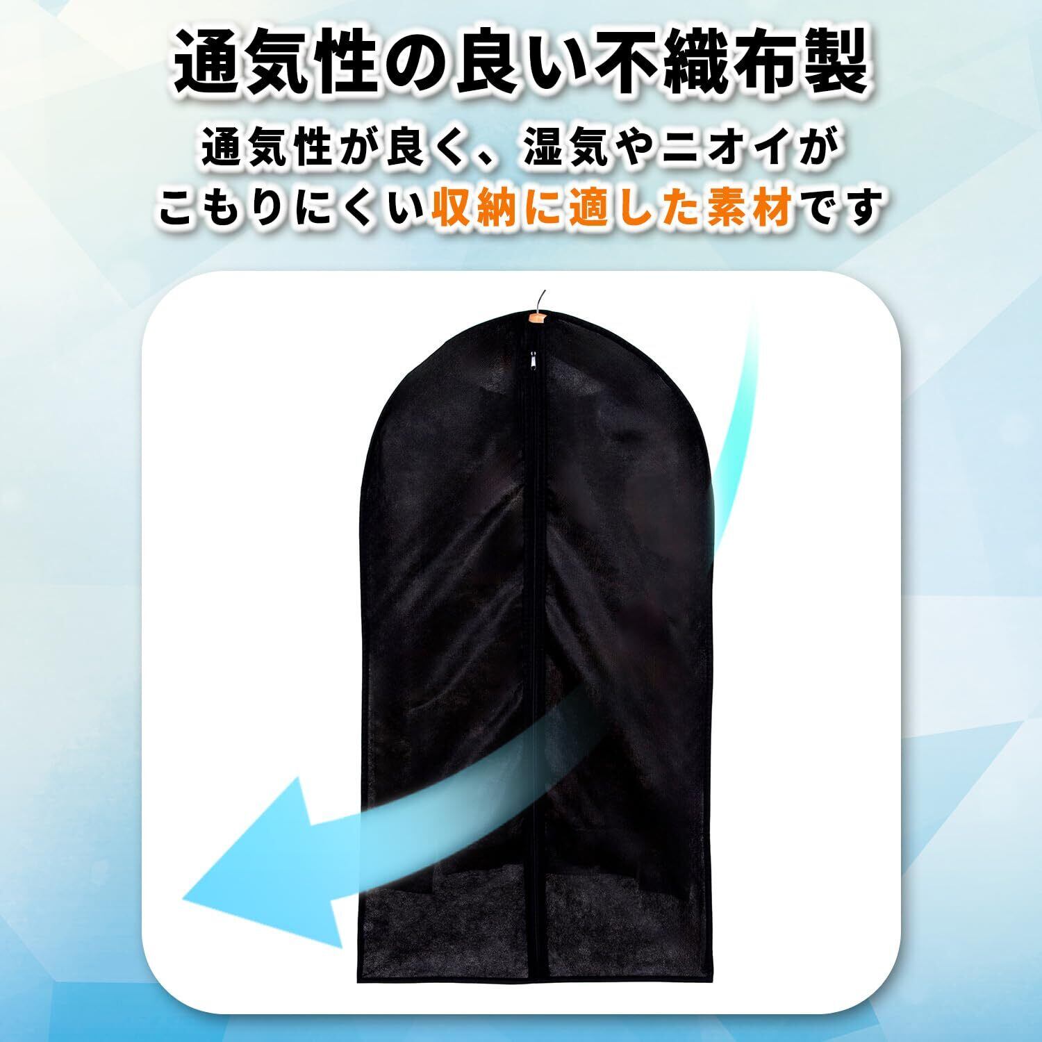 【通気性の良い不織布製の衣類カバー】:通気性が良く湿気やにおいのこもりにくい不織布製の衣類カバー。