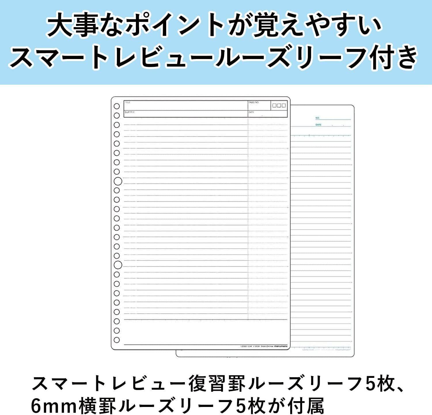 【付属品】6mm横罫ルーズリーフ5枚、6mm復習罫ルーズリーフ5枚、えんぴつで書けるインデックス大5山+小5山、クリアポケット1枚