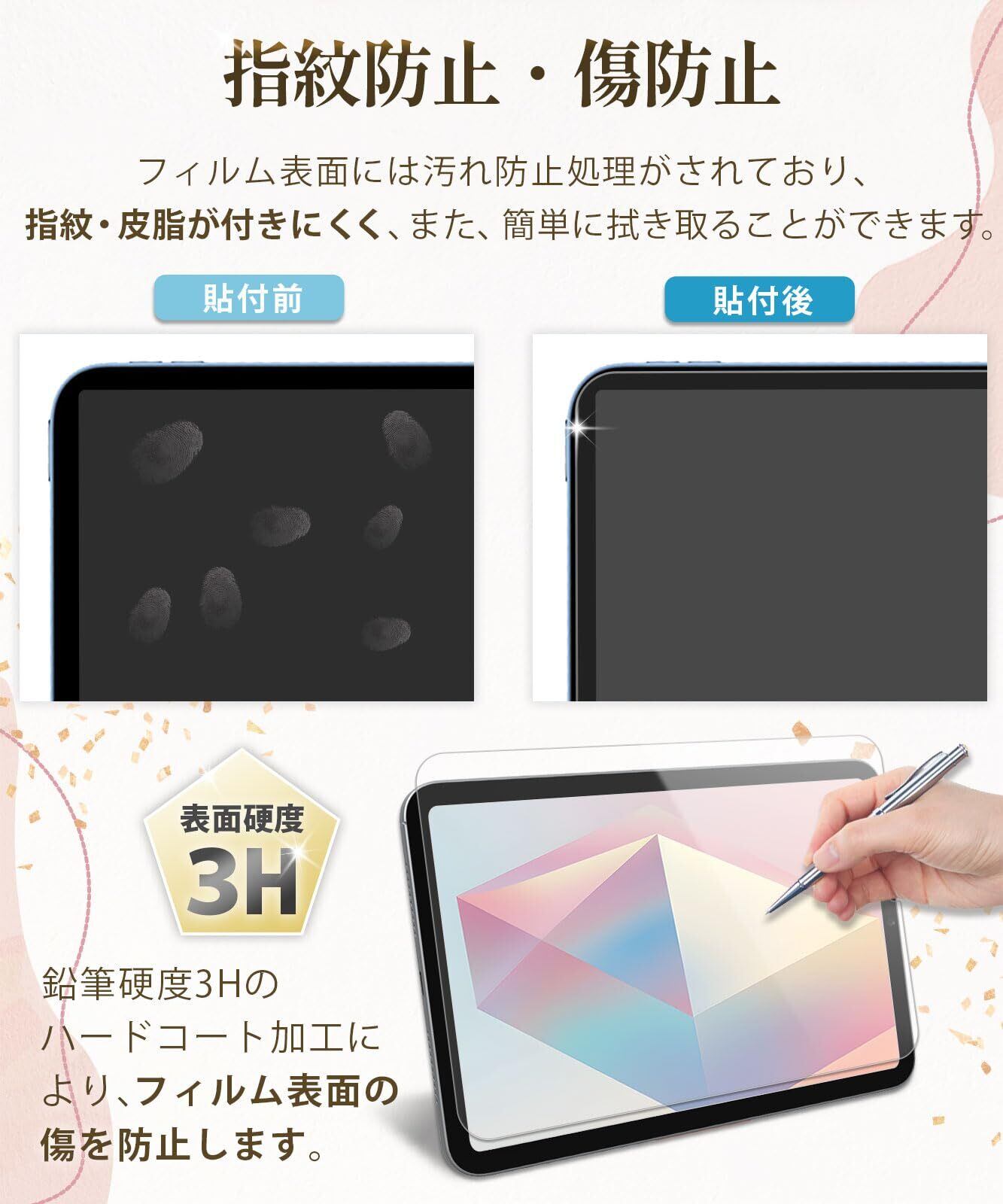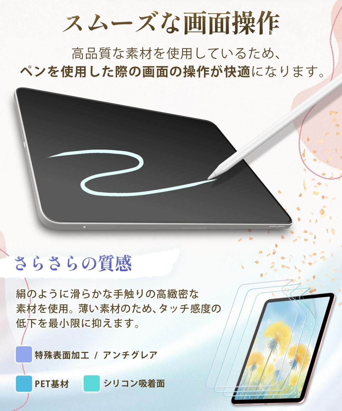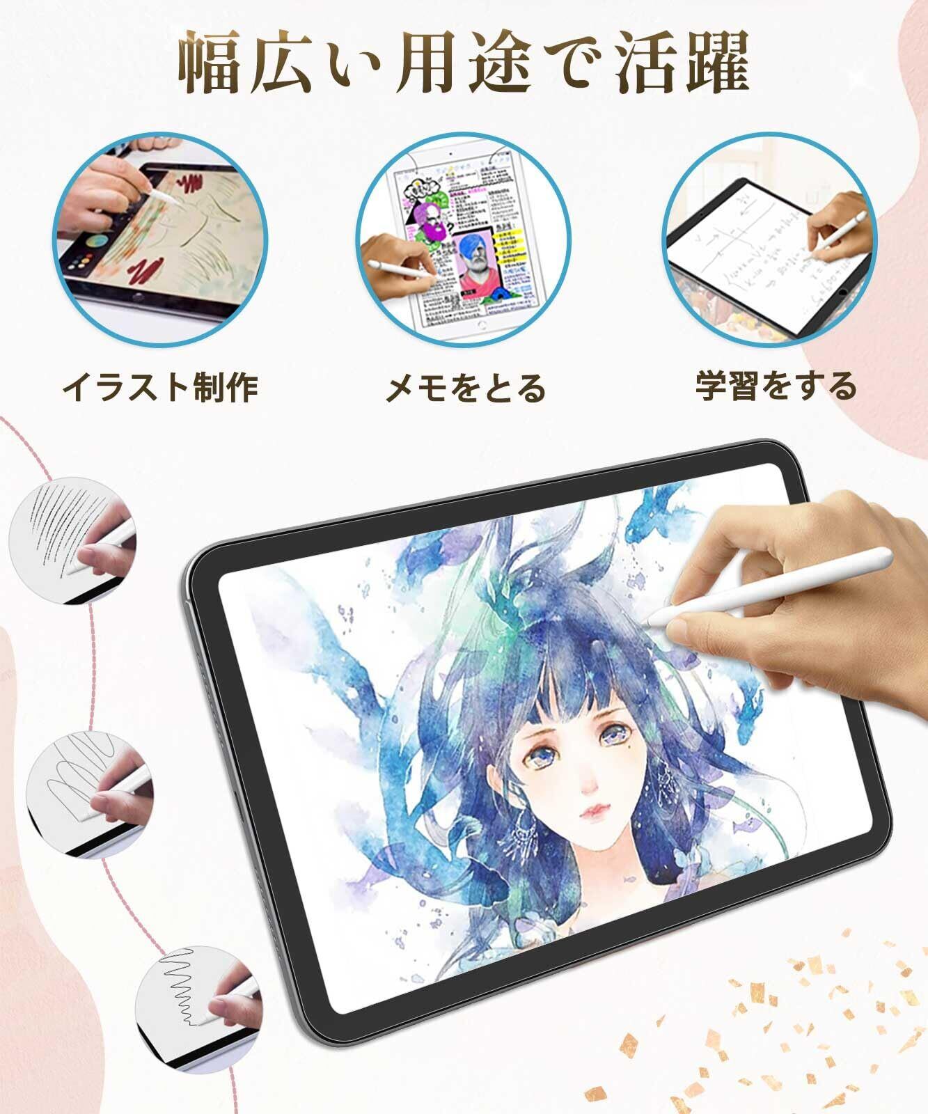 【紙のような描き心地】特殊表面加工により上質紙に鉛筆で描いたような描き心地を実現。 iPadで手書き作業をする人(ノート作成やイラスト)におすすめのペーパーライクフィルムです。️安い商品より圧倒的に書きやすい! さらさらした手触りで、書き味にこだわりたい方に最適です。また、表面を保護し、傷や汚れも防ぐ液晶保護フィルム(画面保護シート)です。