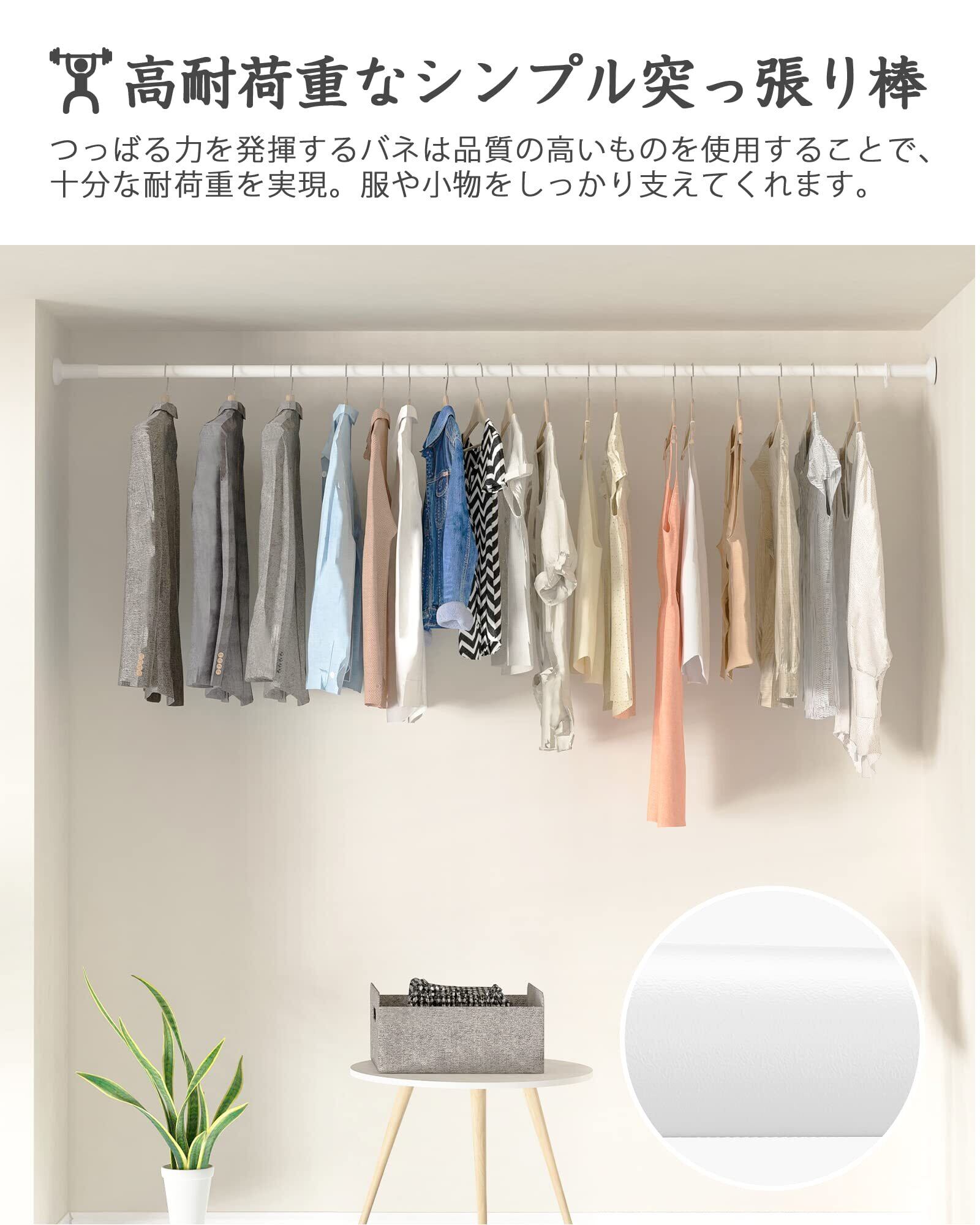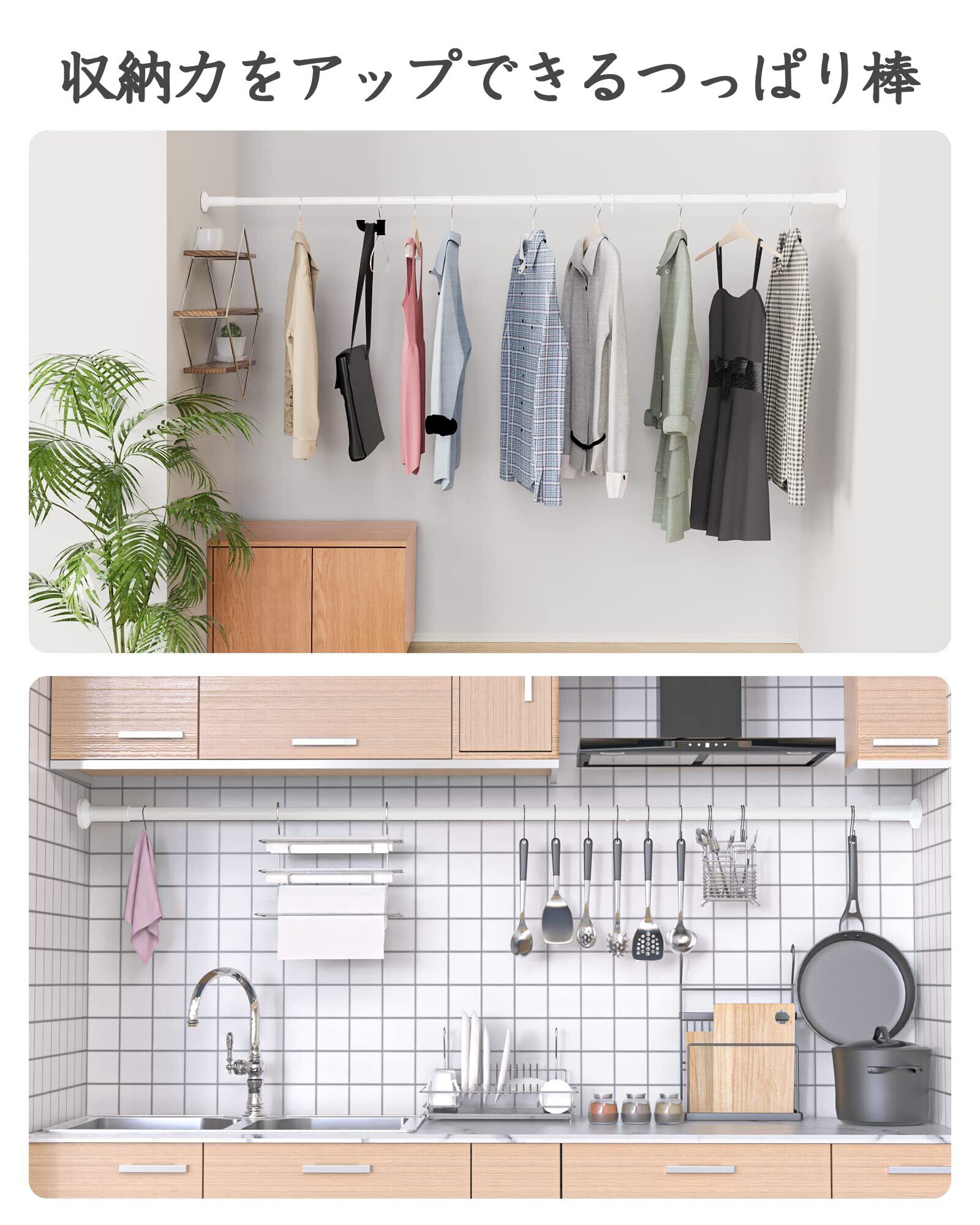 【収納力アップ・省スペース】つっぱり棒は自由に長さが調節でき、どこにでも設置でき、狭いスペースはもちろん、家の中のデッドスペースにも使えます。例えば:洗濯物を室内で干す、廊下でも部屋干し、ベランダの外に干す、つっぱり棒、クローゼットロッド、浴室用タオル掛け、室内用カーテンロッド、シャワーカーテンロッド、布団干し、物干し竿、キッチン用品収納。