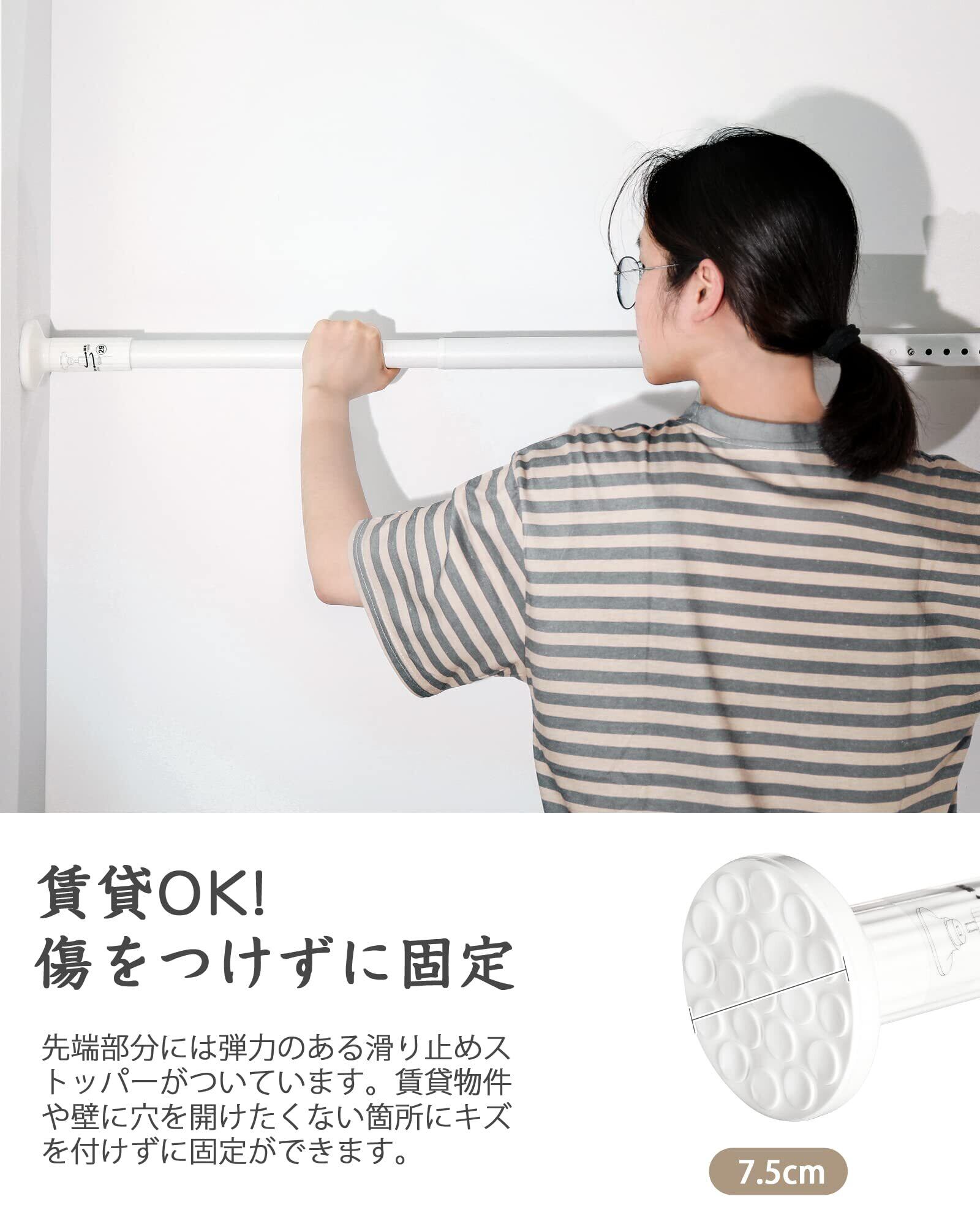 【耐荷重抜群】つっぱり棒は炭素鋼製で、強い負荷に耐えられます。强力ばねを内蔵して、長く伸ばしてもずれ落ちる心配がないです。接着面が滑り止めゴムを採用するので、摩擦力が增えます。