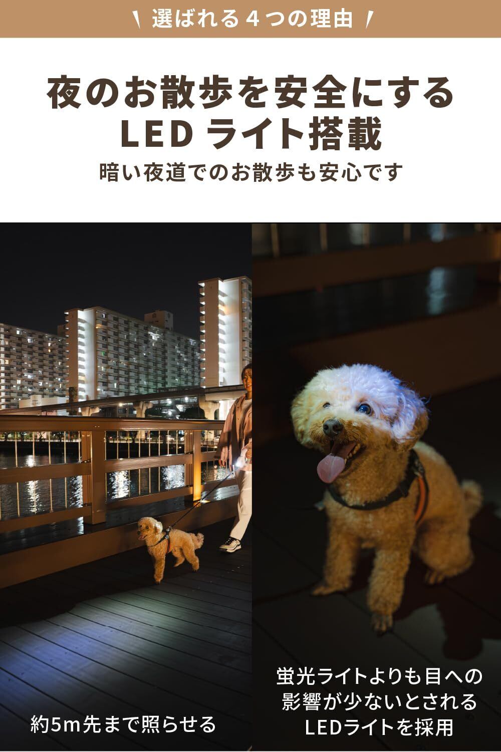 【LEDライト付きリード】ワンタッチで簡単にライトを点灯することが出来ます。遅い時間にお散歩しても明るく光るので、安心して夜間も散歩できます。