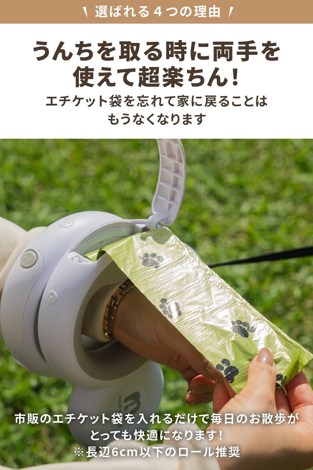 【うんち袋収納可能】持ち手部分にうんち袋を収納することができるため、別々に持ち歩くことなくお家に忘れることもありません。ロールタイプの袋を外に引っ張り出して収納蓋を閉めると片手で簡単に袋をちぎることができます。手ぶらでストレスフリーなお散歩をお楽しみください。
