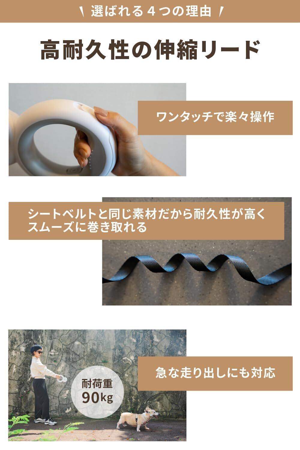 【最長3mの伸縮リード】伸縮機能があるためリードが長すぎてコントロールしづらいという悩みは無くなり、気軽にお散歩を楽しむことができます。自動車のシートベルトに使われている素材と同等の高密度のナイロンベルトを使用しているので噛みちぎられる心配もなく、絡まりにくいので長く伸ばしてもスムーズに巻き戻すことができます。