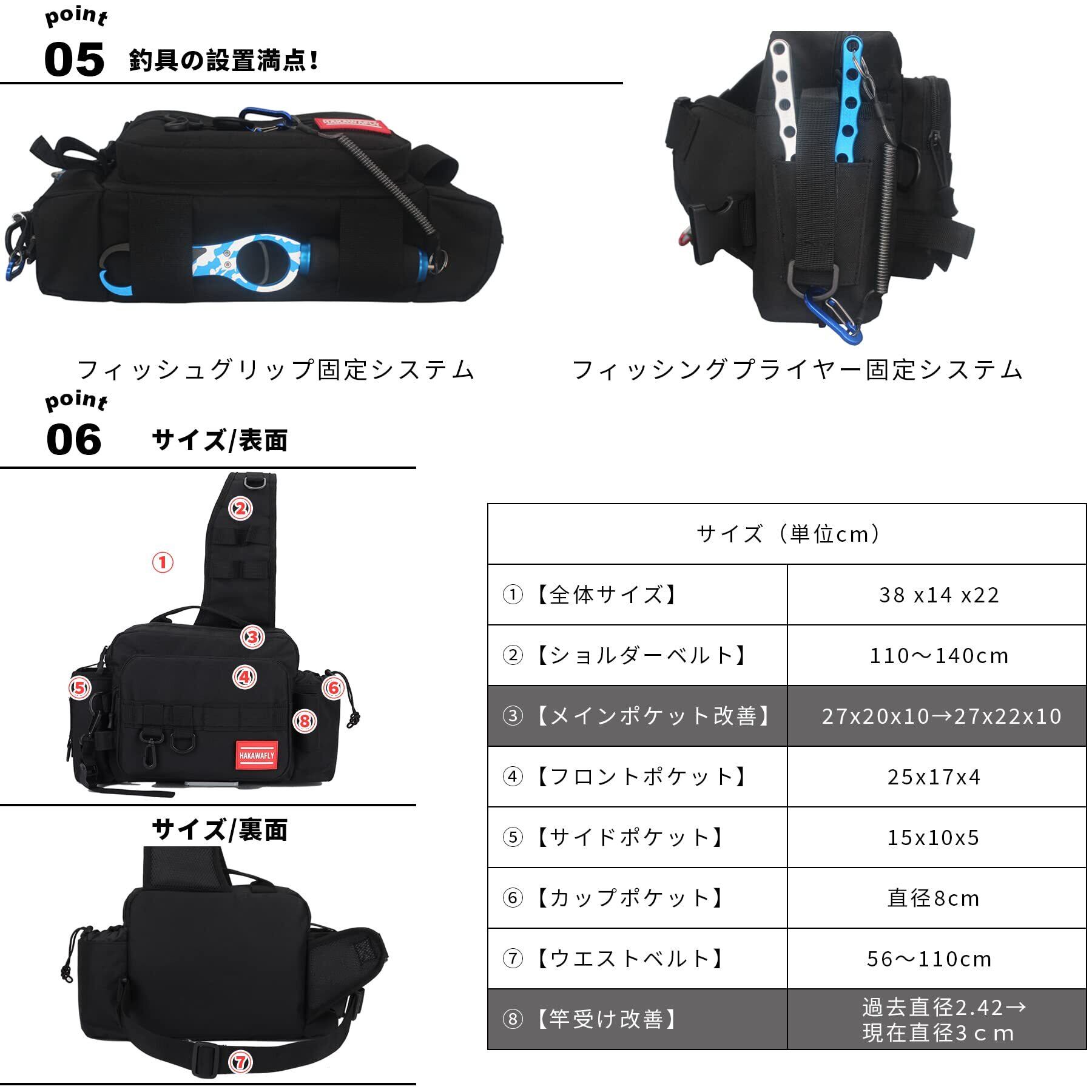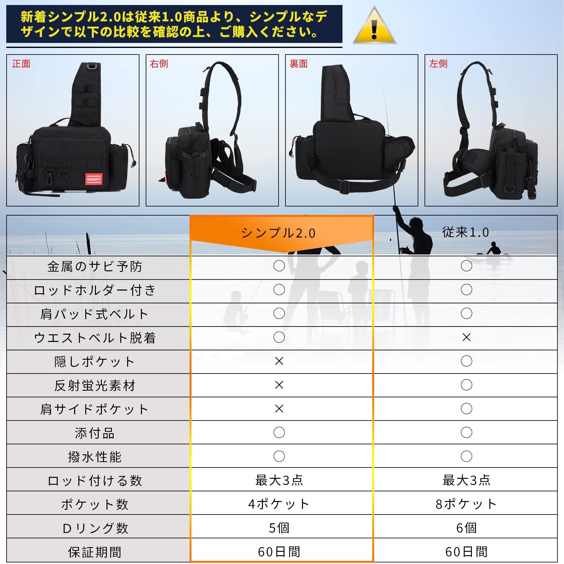 【2022年改良版シンプル2.0釣りバック5WAY式大活躍と最大3点ロッドを付ける】お客様の声に応じる改善point3:①竿受け3cmまで、②メインポケット高さを2cm拡大、③ウエストベルトが脱着可能に。5WAY式、フィッシングバッグ・ショルダーバッグ ・ ウエストバッグ ・ ハンドバッグ ・ メッセンジャーバッグ としてもおすすめです。3点で固定できる簡易ロッドホルダーを利用可能です。軽量で大容量、機能性にも優れる釣り用バック。