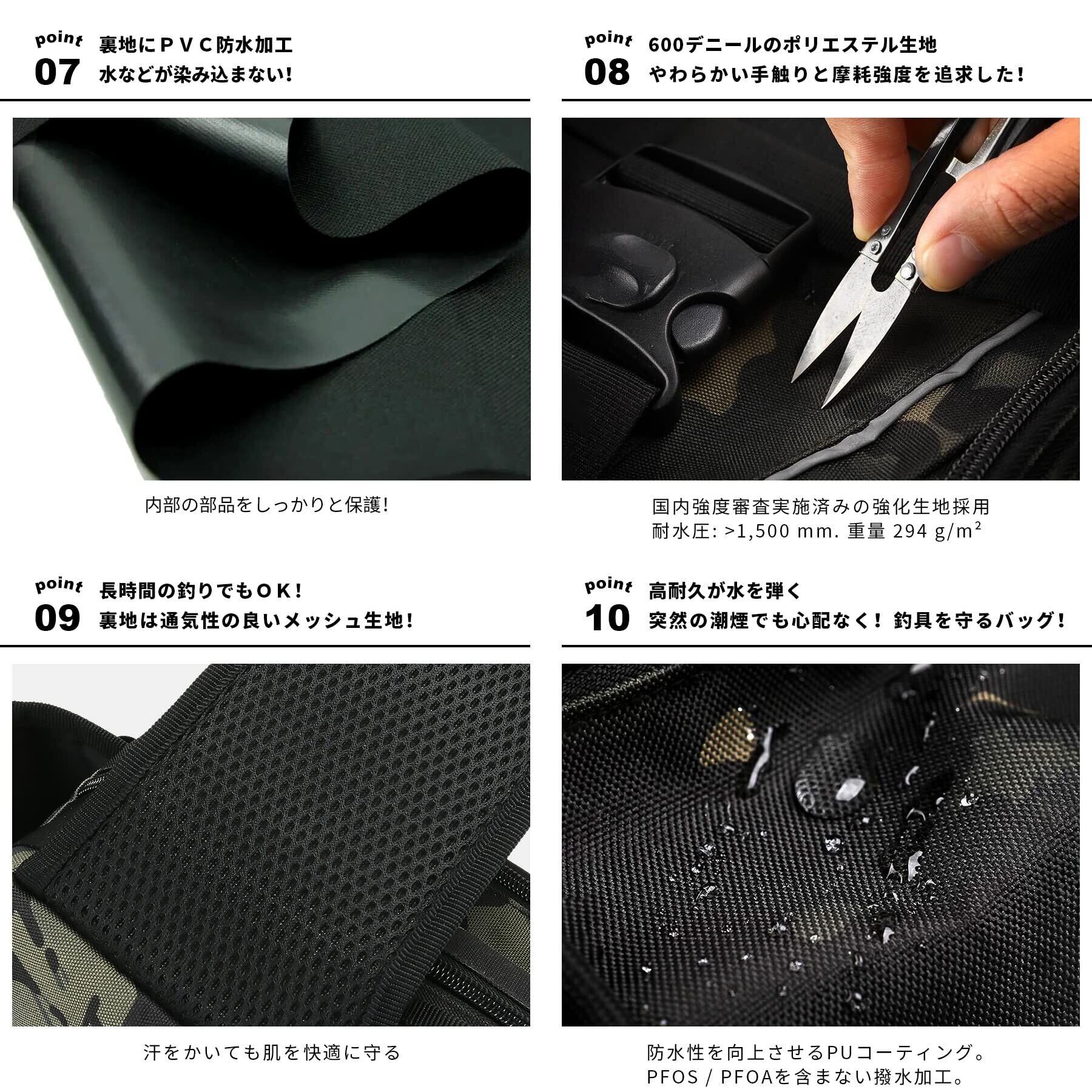 【高品質材料防水タックルバッグ】「釣り専用」に基づいて、作り上げた釣り用バッグ。釣り用に購入するには最適。「いつでもこれ一個で釣行」そんな職人の想いを込めて丁寧に作られていますルアーバッグ。900D オックスフォードポリエステル, ブルーサイン認証。やわらかい手触りと摩耗強度を追求した900デニールの平織りポリエステル生地を縫製した釣りばっく。防水性を向上させるPUコーティング-PFOS / PFOAを含まない撥水加工。耐水圧: >1800 mm. 重量 294 g/m²。