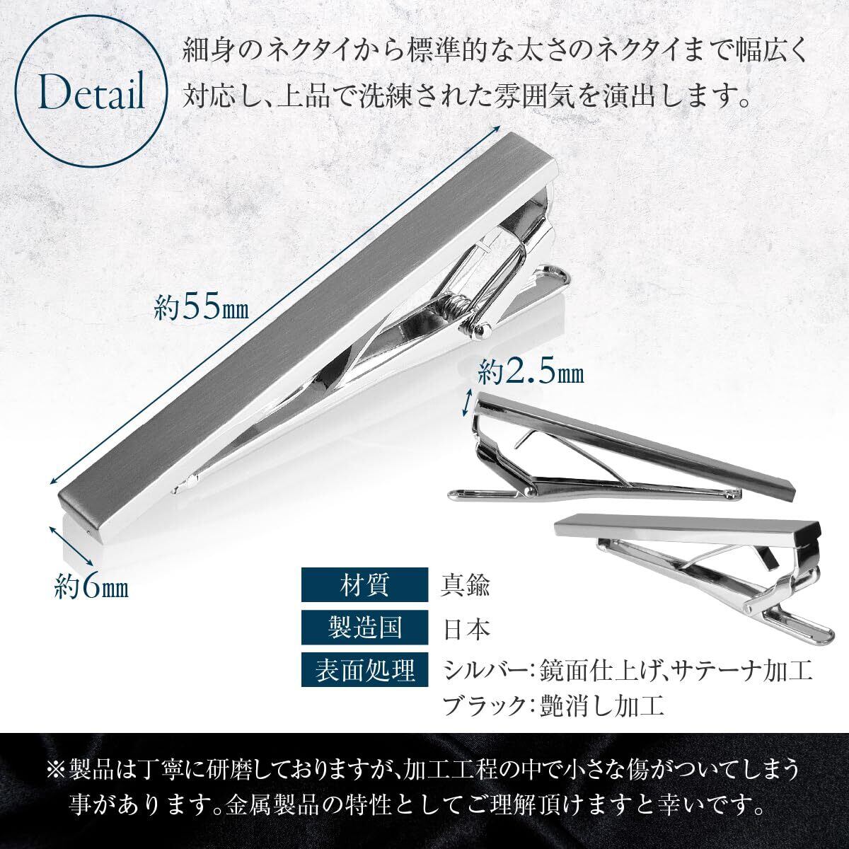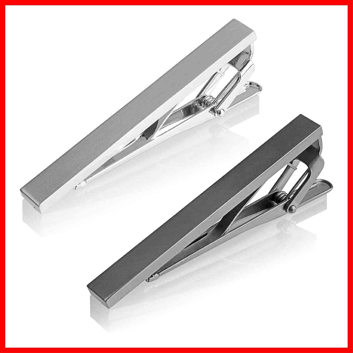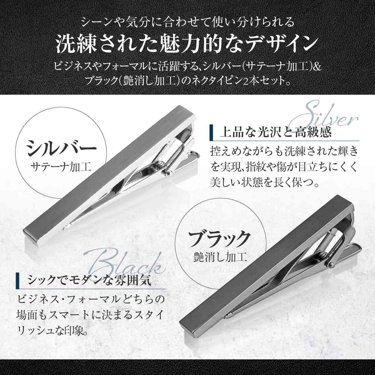 Emvalo ネクタイピン 2本セット 日本製 サテーナ加工シルバー&艶消しブラック ワニ口クリップ フォーマル