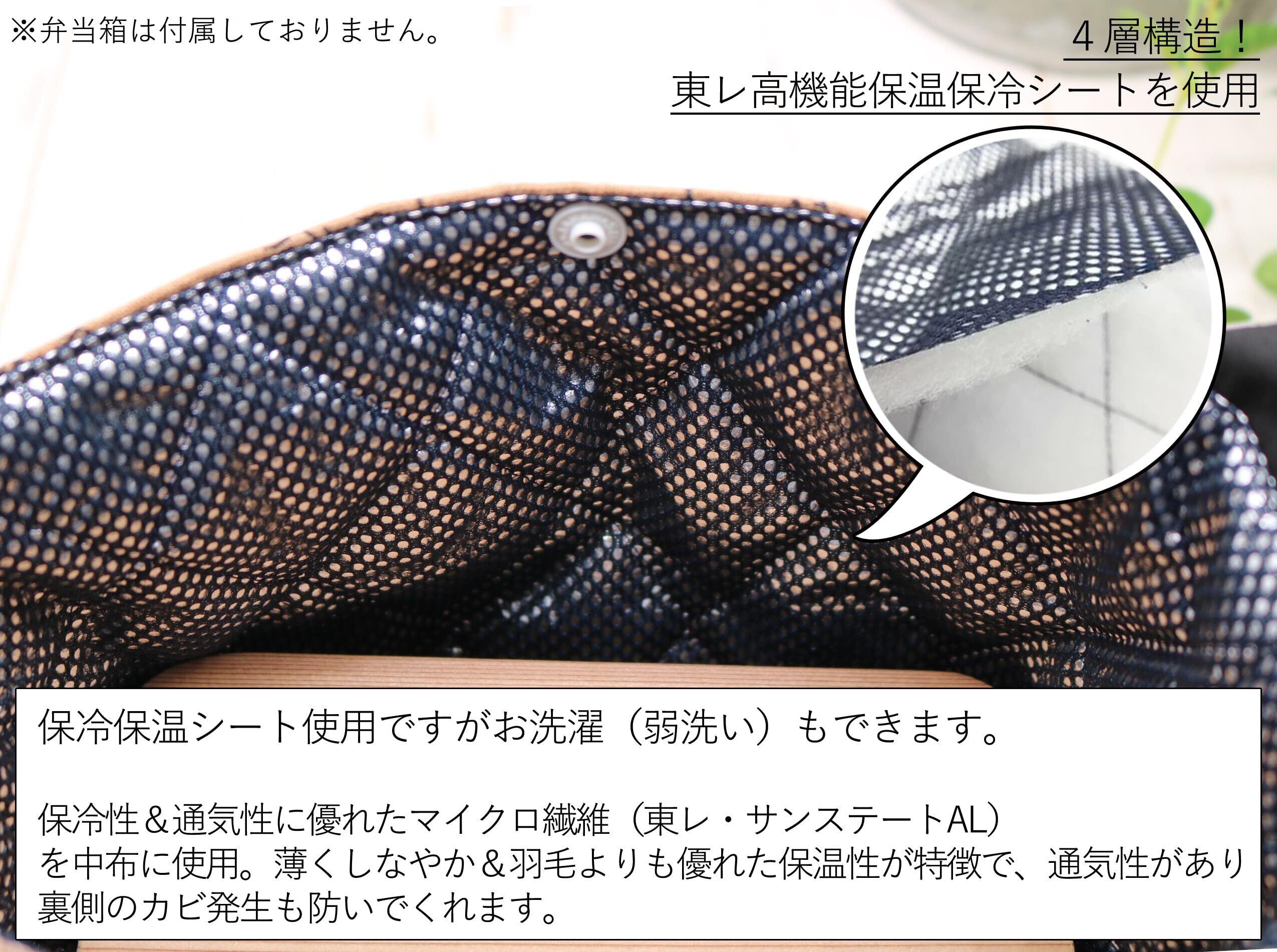 保冷・保温のお弁当袋で、お洗濯が可能です。一般的な保冷保温シートとは違い、裏にカビが生えたりはがれてくることがなく布のような柔らかさがあります。折り目の角が破れることもありません。