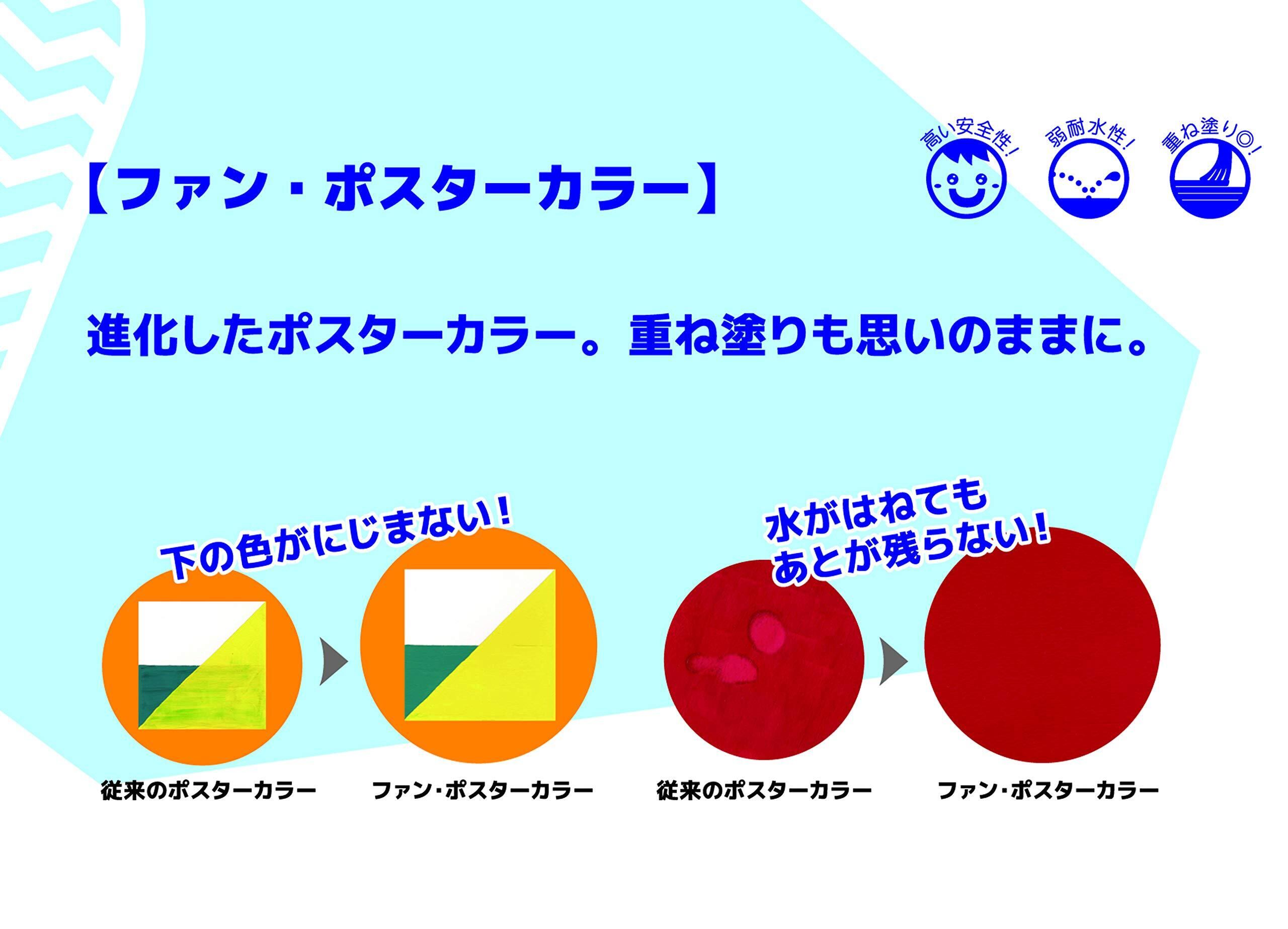 ファン・ポスターカラーは従来のポスターカラーと違い、乾燥後にわずかな耐水性を有します。