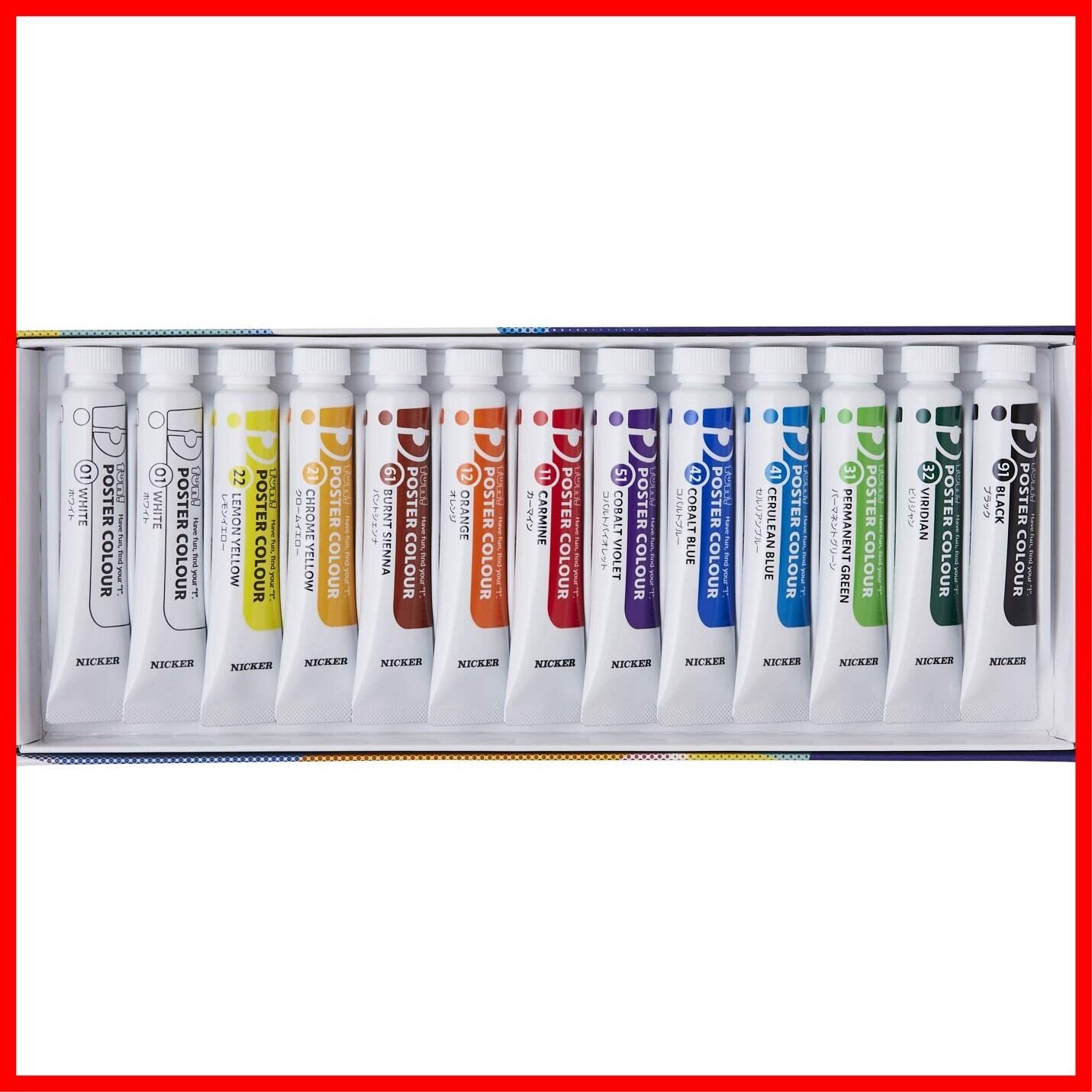 カラー:ホワイト(2本)、レモンイエロー、クロームイエロー、バントシェンナ、オレンジ、カーマイン、コバルトバイオレット、コバルトブルー、セルリアンブルー、パーマネントグリーン、ビリジャン、ブラック