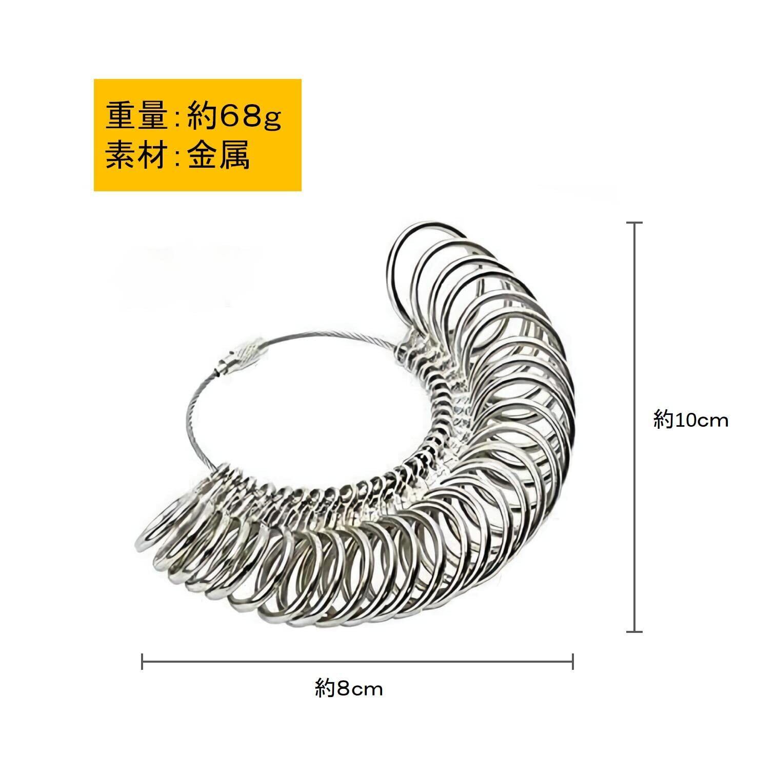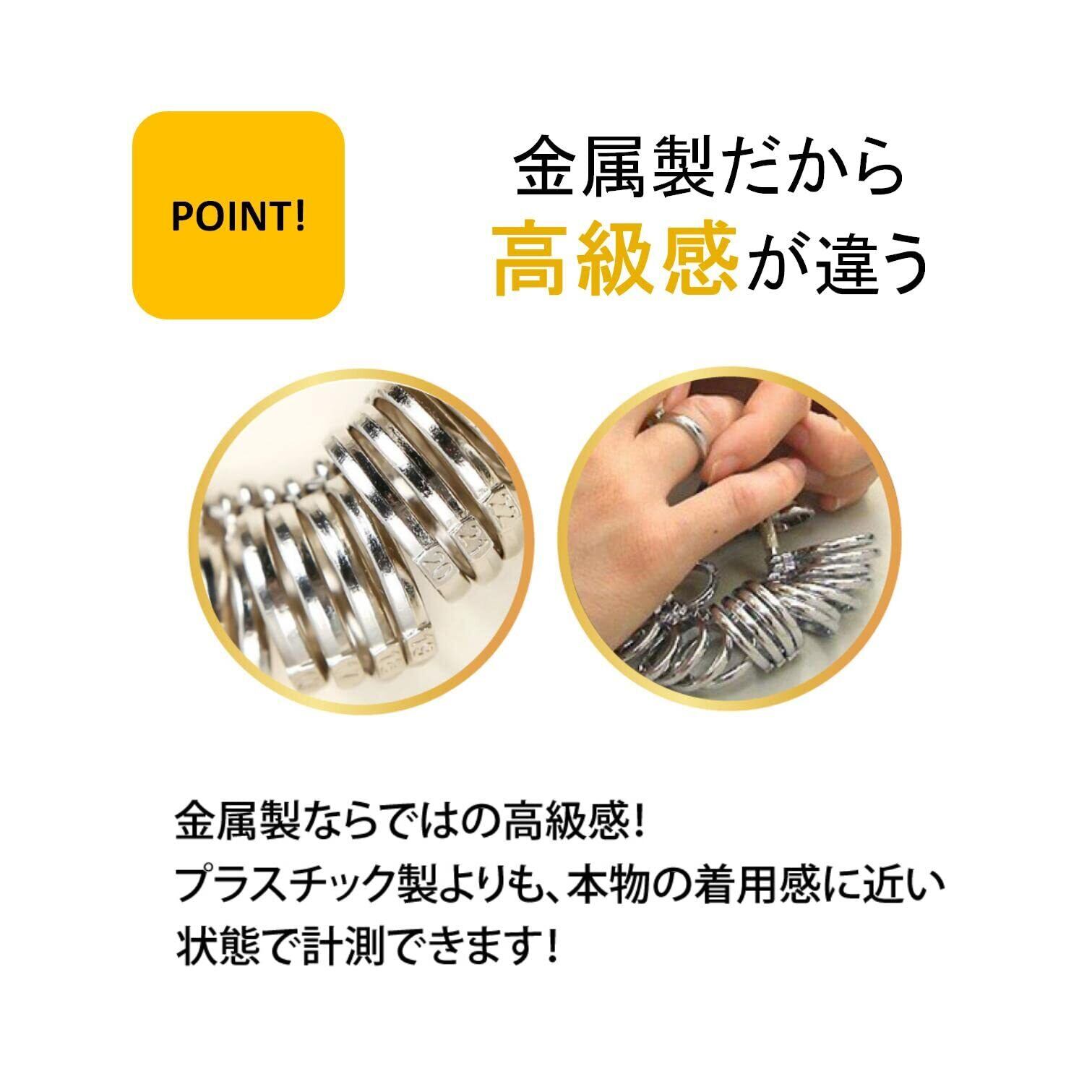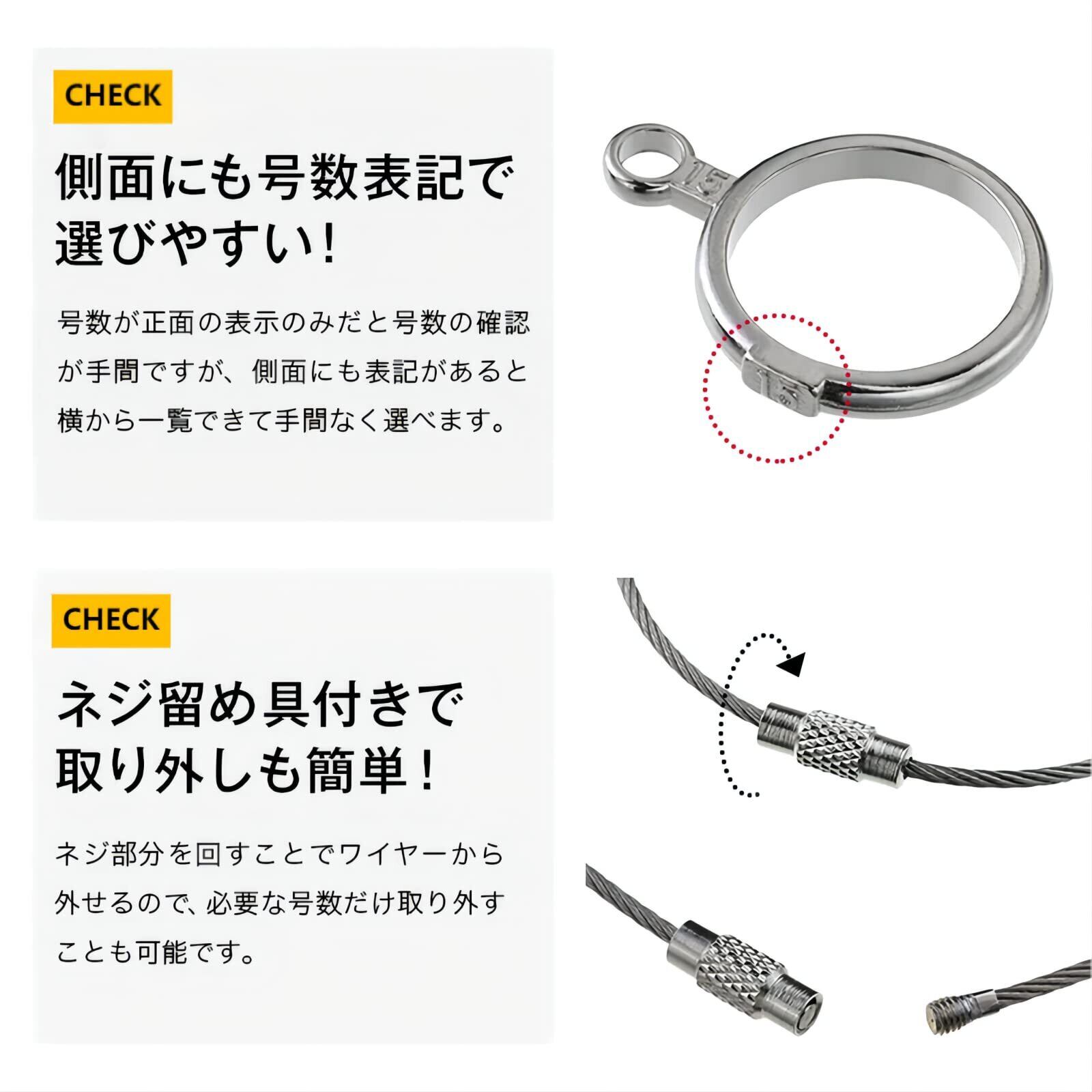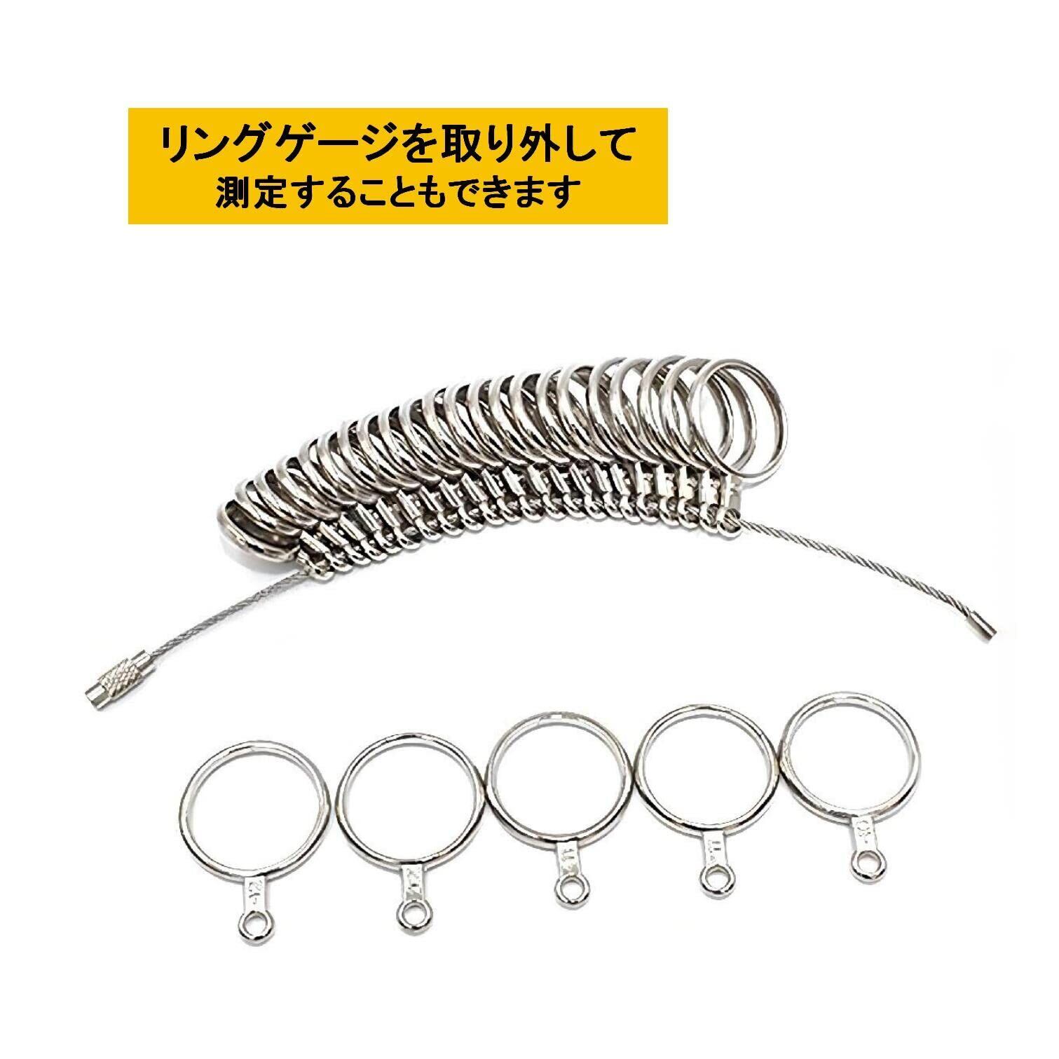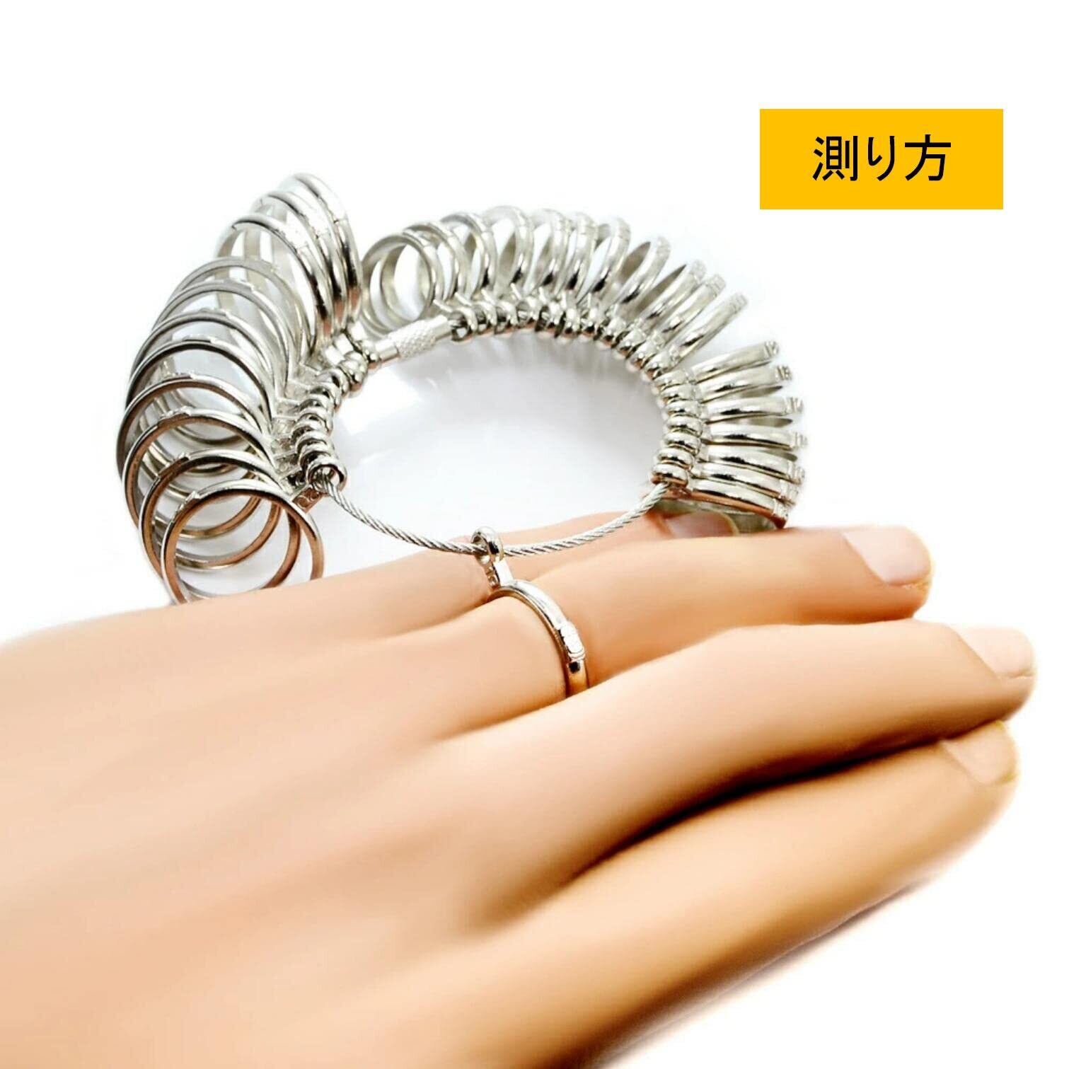 【測定時のご注意】リングゲージ 自体の重さで 指 と ゲージ の間に隙間ができ、実際の サイズ より緩くなる場合があります。測定時には、ワイヤーから外すか手のひらに接地させてお測り下さい。指輪を着ける指の腹より第二関節が太い方は、関節が無理なく通るサイズが適正なサイズとなります。