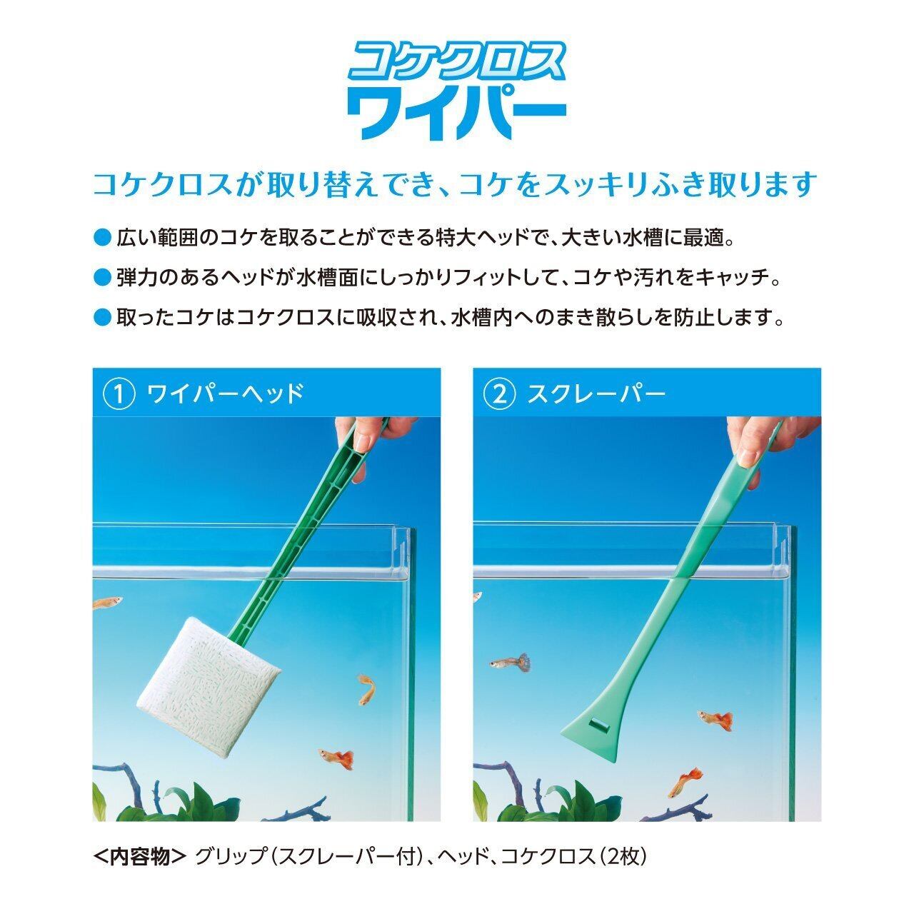 手を汚さずにコケそうじ。コケクロスワイパー、コケクロス8枚入×2個、水槽おそうじ手袋の4点セット。コケクロスが取り替えでき、コケをスッキリふき取ります。広い範囲のコケを取ることができる特大ヘッドで、大きい水槽に最適。弾力のあるヘッドが水槽面にしっかりフィットして、コケや汚れをキャッチ。取ったコケはコケクロスに吸収され、水槽内へのまき散らしを防止します。用途に合わせて、首振りヘッドとスクレーパーから選択できます。※水槽おそうじ手袋のカラーは選べません。ブルーの場合もございますので予めご了承ください。【お試し おそうじパッド付】