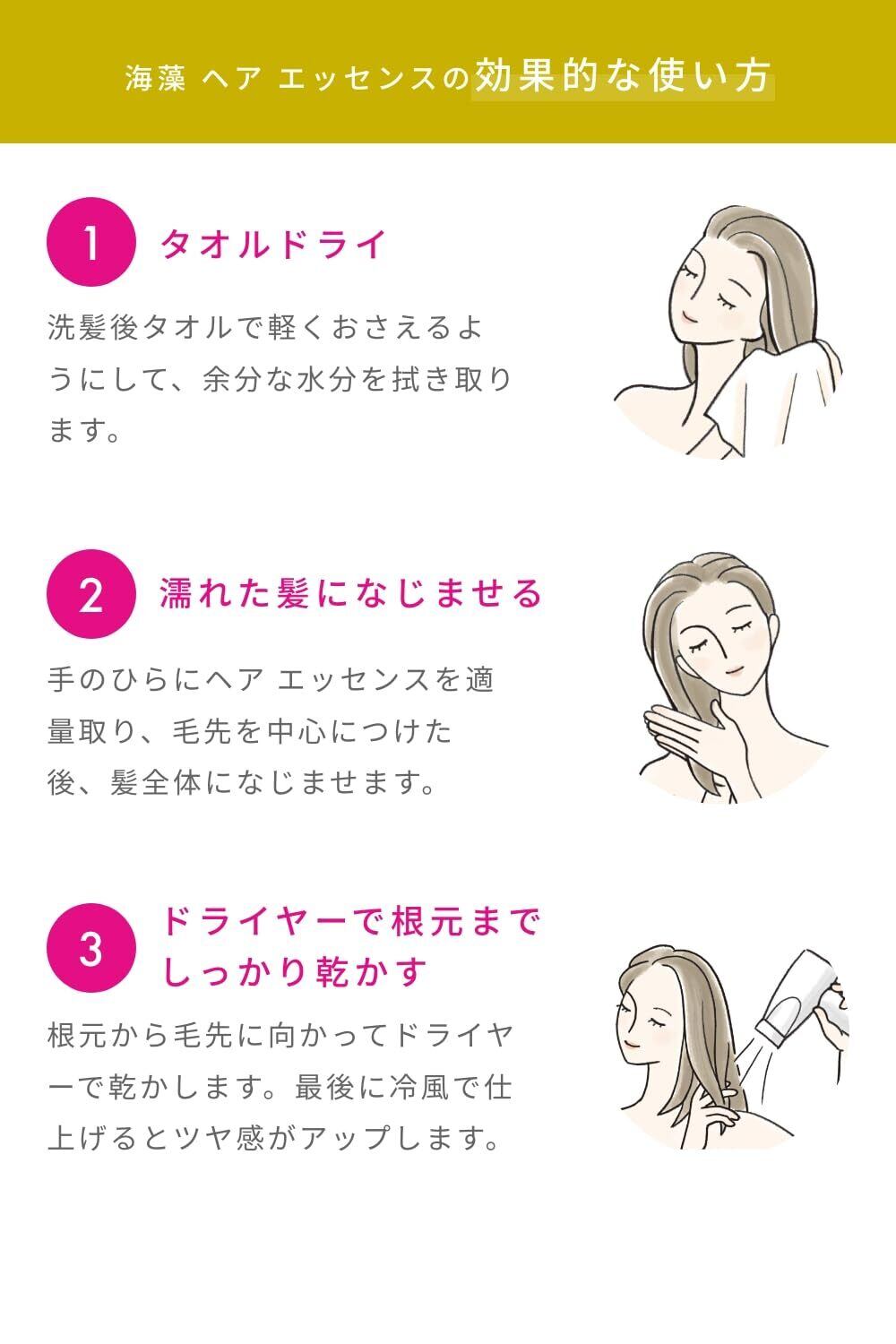 【使用方法】Step1.洗髪後、タオルで軽くおさえるようにして、余分な水分を拭き取ります。Step2.手のひらにヘアエッセンスを適量取り、毛先を中心につけた後、髪全体になじませます。Step3.根元から毛先に向かってドライヤーで乾かします。最後に冷風で仕上げるとツヤ感がアップします。