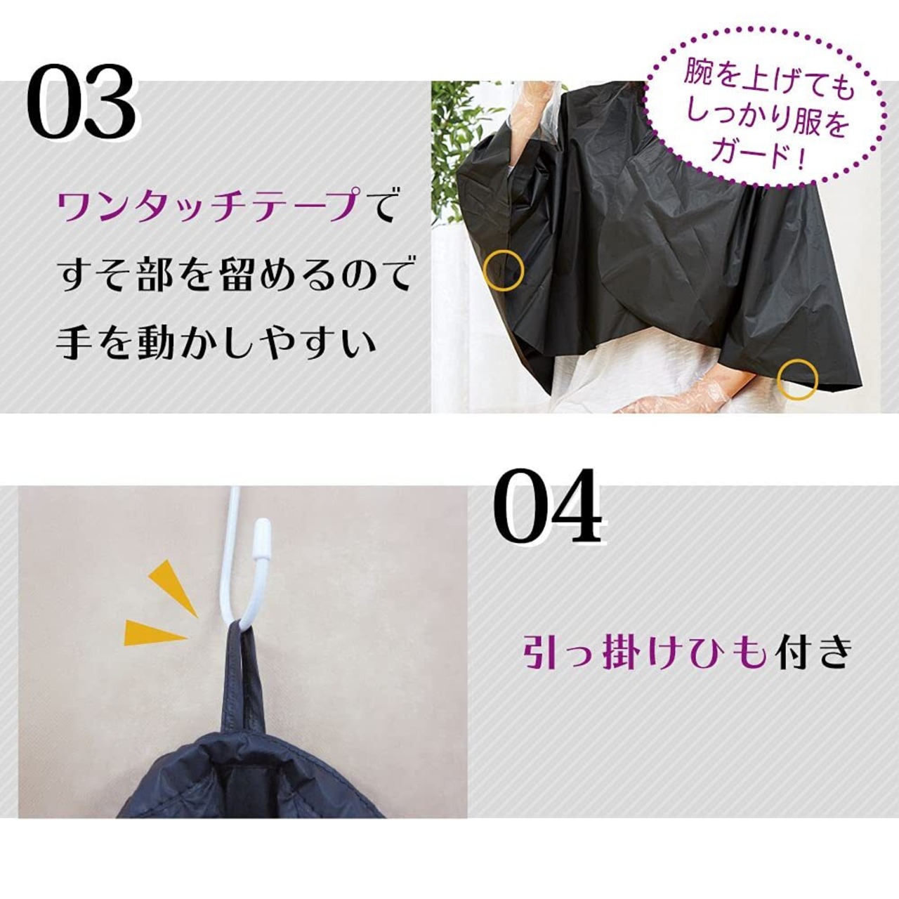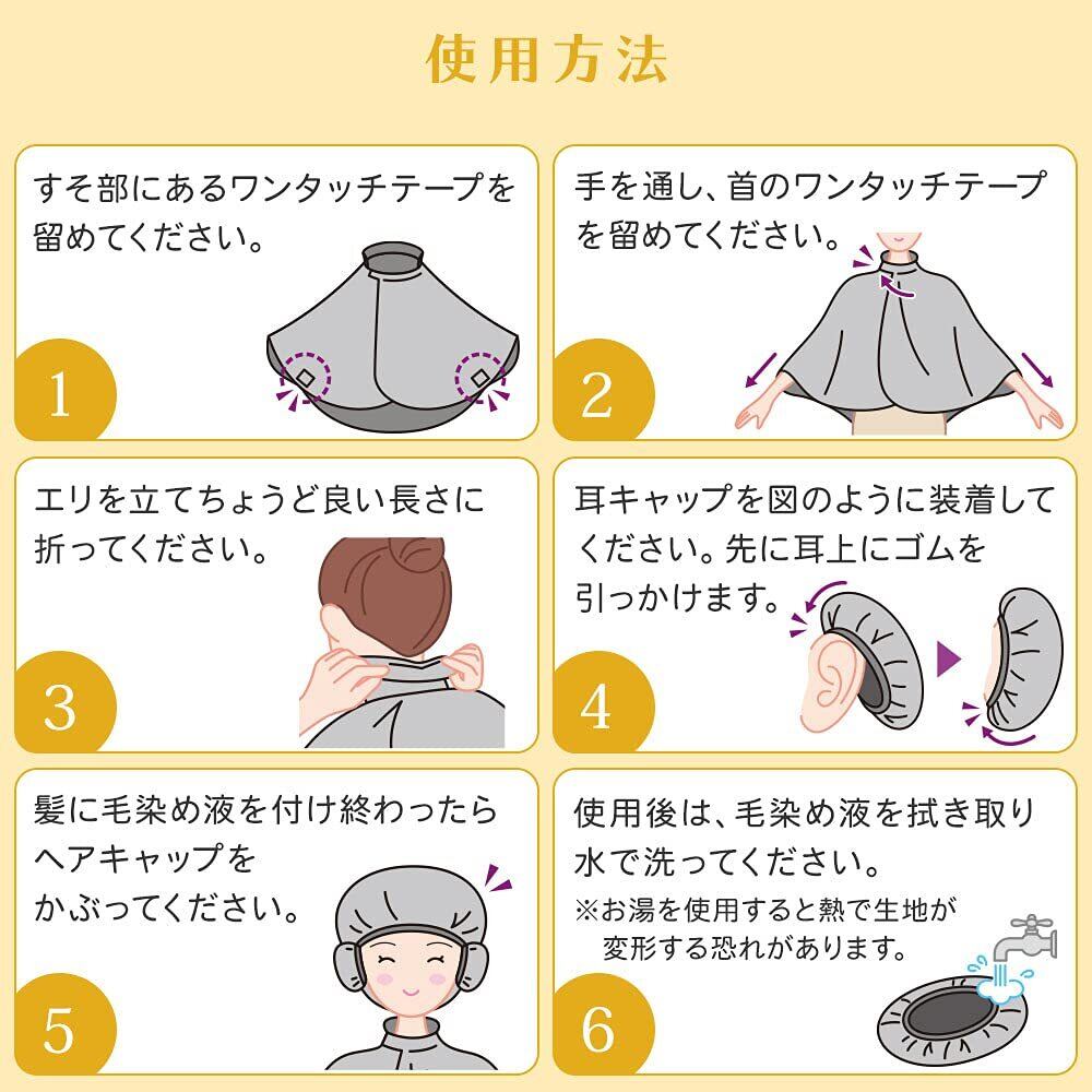 家庭での毛染めに便利なケープ・ヘアキャップ・耳キャップの3点セット。肩から背中まで液ハネを防止!エリ付だから首もとを液だれの汚れからガードします。ワンタッチテープで着脱も簡単!衣類の汚れ防止に。