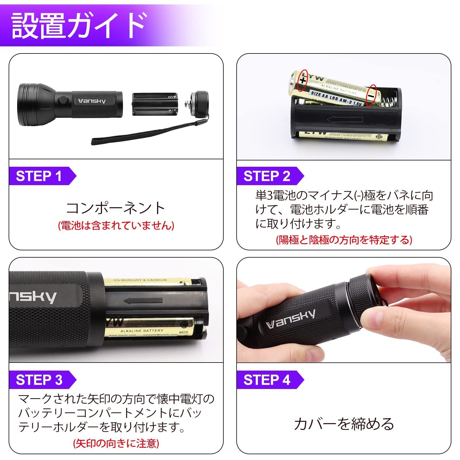 【小型・軽量】:本体は小型で軽量、持ち運びにも便利なUVライトです。また、単4形電池3本を付属しており、お手元に届き次第にご利用いただけます。