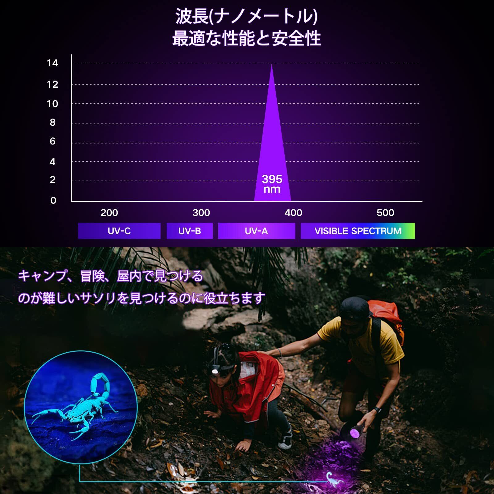 【多様な場合に適用】:ブラックライトはお札やクレジットカード等の鑑定、ペットが皮膚病に感染の確認、UVレジン硬化、宝石・鉱物の検査、骨董の修復の鑑定、服や化粧品に含まれる蛍光増白剤の検索、サソリを捉え、夜釣りなど多様な場合に適用します。
