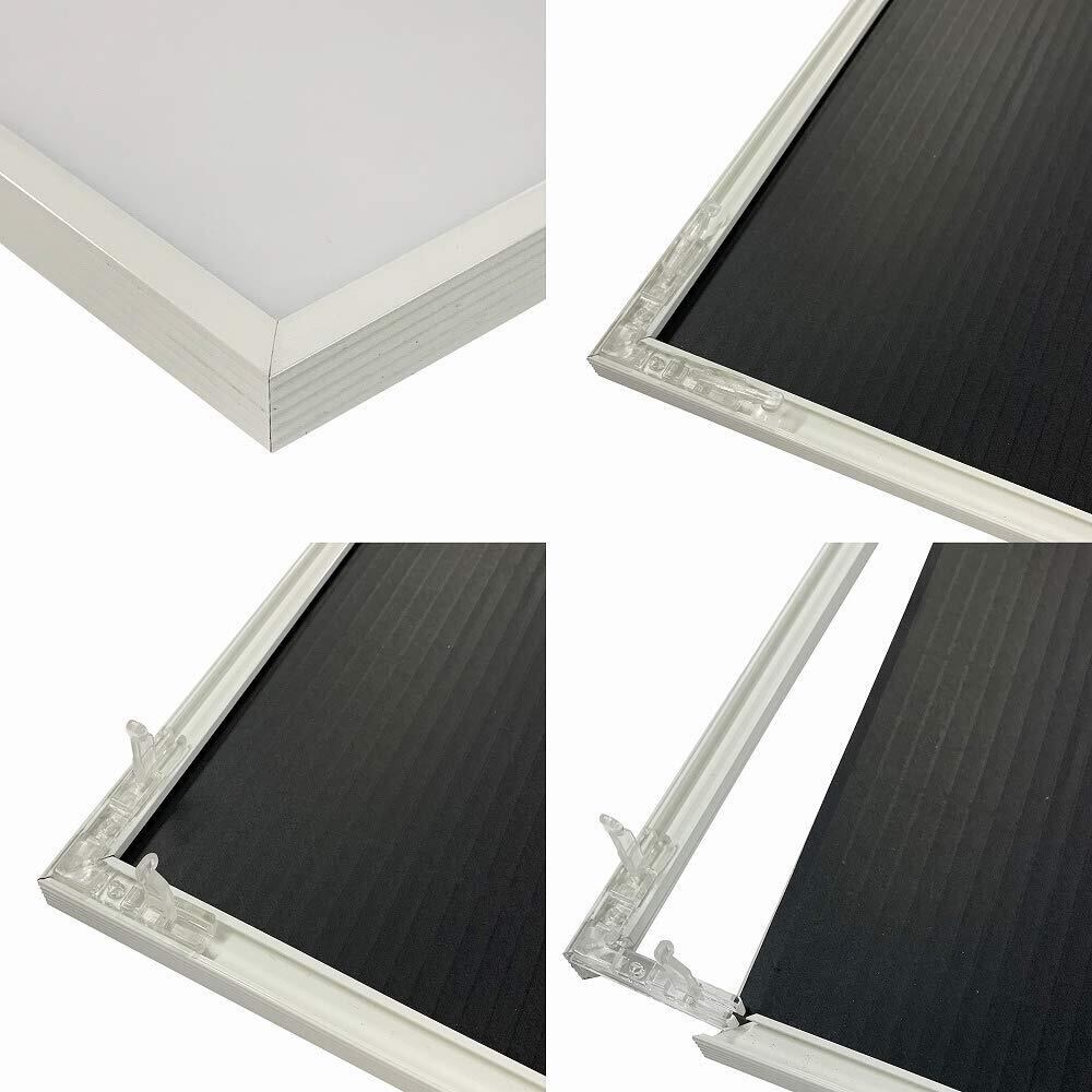 細身なシンプルデザインでありながら、ハイエンドモデルのクオリティをあわせ持つアルミフレームです。特にポスターなどを飾るのに最適です。ポスターの他にも、中台紙を1枚はずすだけで最大3mm厚まで対応。作品の出し入れは、コインで回せるネジ2個をゆるめるだけ。タテヨコどちらでも使用出来ます。吊下げ用のヒモ付属。