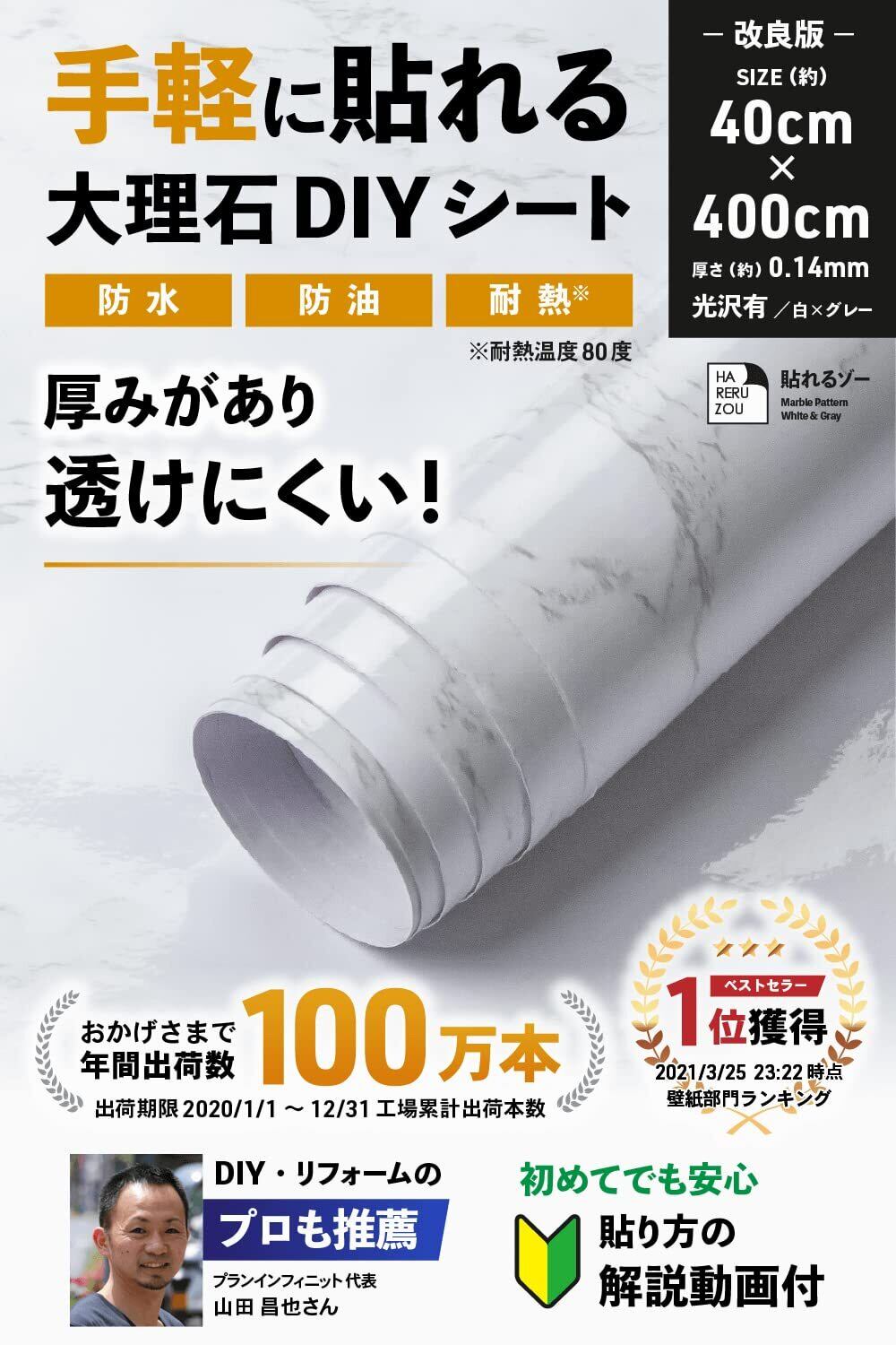 【DIYのプロ推薦】 大理石シート リメイクシート 壁紙シール 40×400cm 厚手 防水 耐熱 (解説動画付) 白 グレー 光沢 はがせる おしゃれ キッチン 貼れるゾー