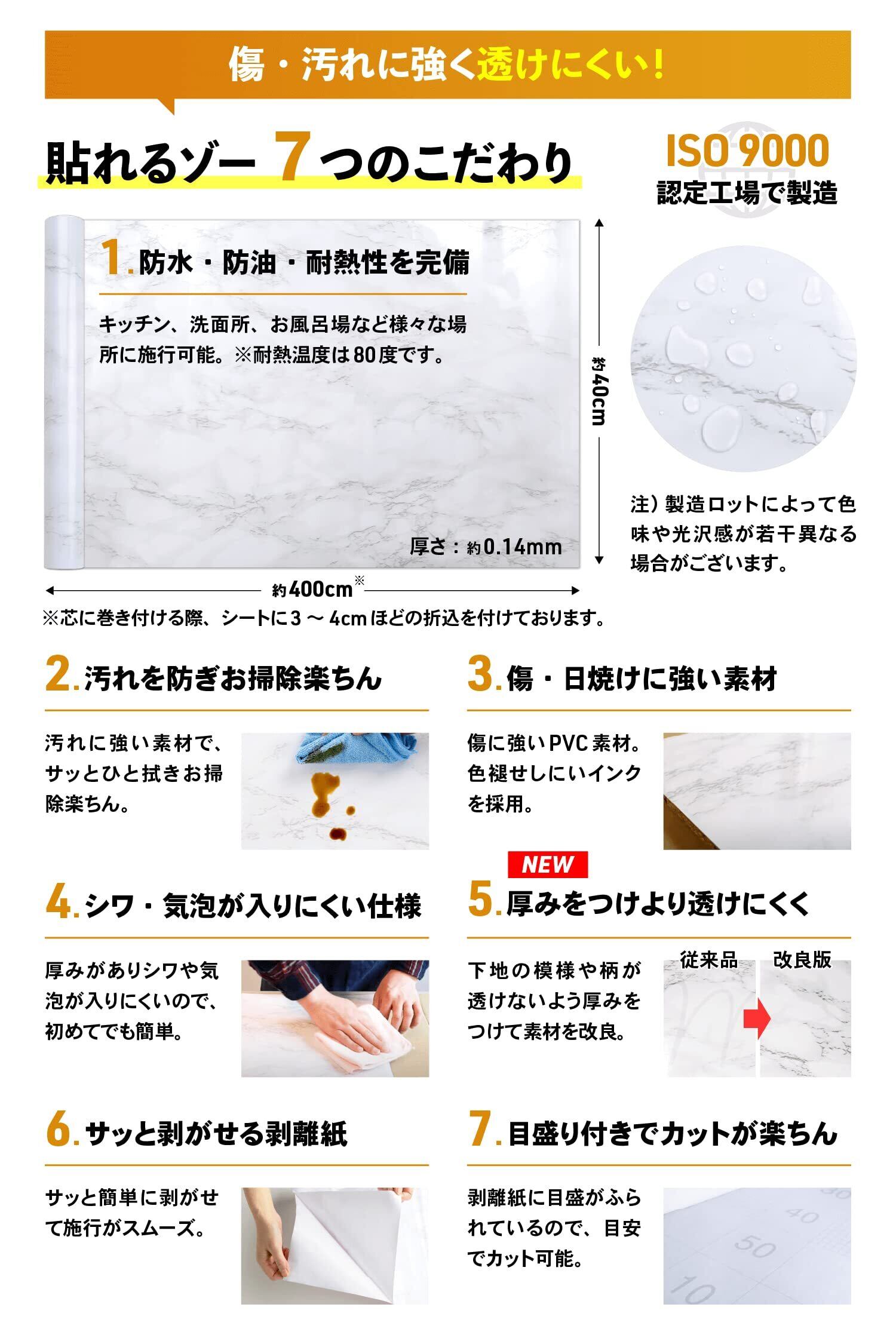 壁紙シール 【商品仕様】素材:高品質PVC/大理石柄/光沢 ツヤあり/白・グレー/サイズ:3サイズ(40cm×200cm、40cm×400cm、60cm×500cm)/厚み:約0.14mm(厚手) 【特徴】汚れ、傷、日焼けに強い素材。撥水性が高く、防汚・防カビ効果も期待できます。掃除はサッとひと拭き、床に貼れば床掃除も楽ちんです。【サイズアップ参考例】40×400cm×2枚:幅70cm~80cm・長さ800cmまで/40×400cmと60×500cm 各1枚ずつ:幅90cm~1m・長さ900cmまで/60×500cm×2枚:幅110cm~120cm・長さ10mまで/60×500cm×4枚で長さ20mまで。