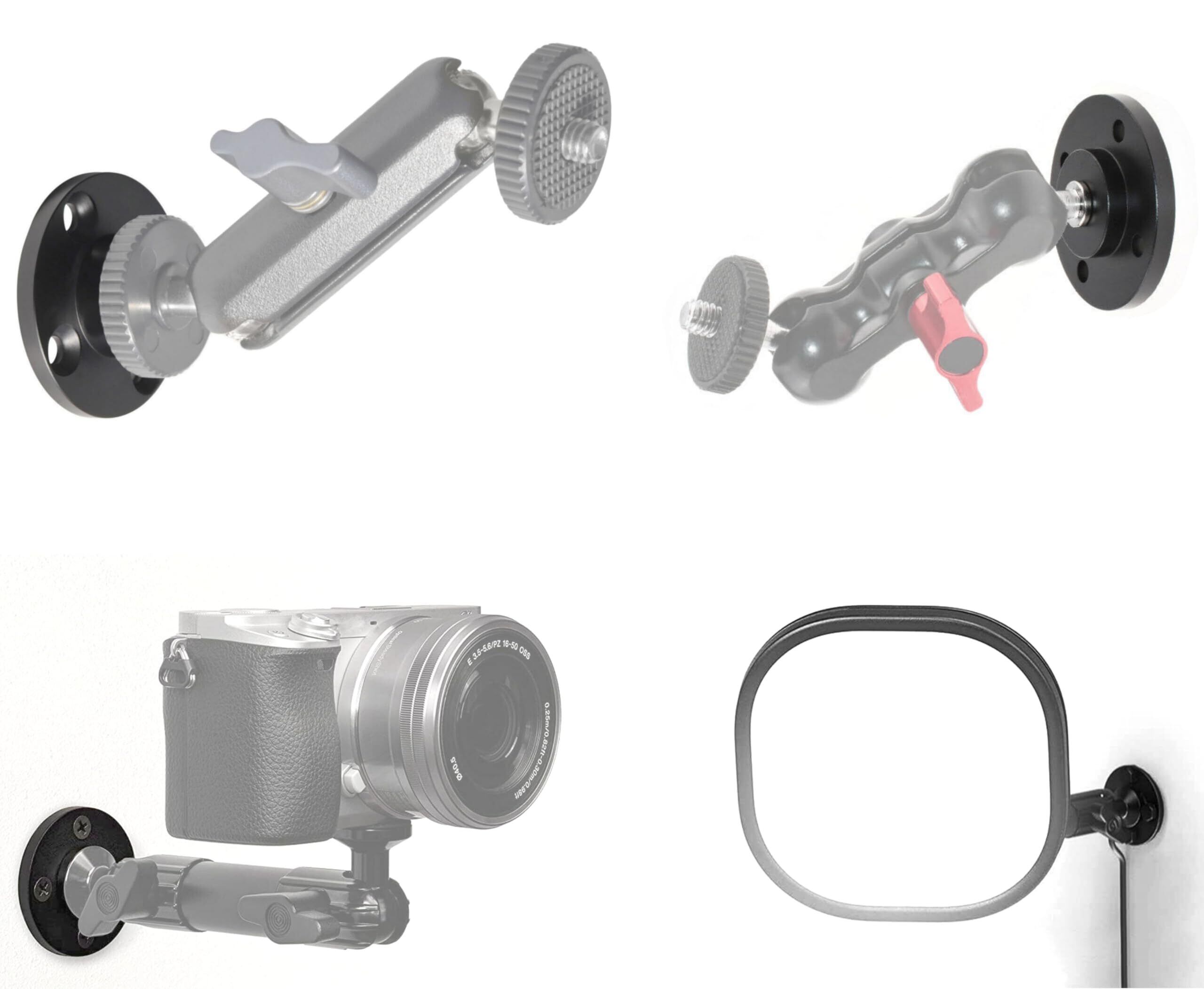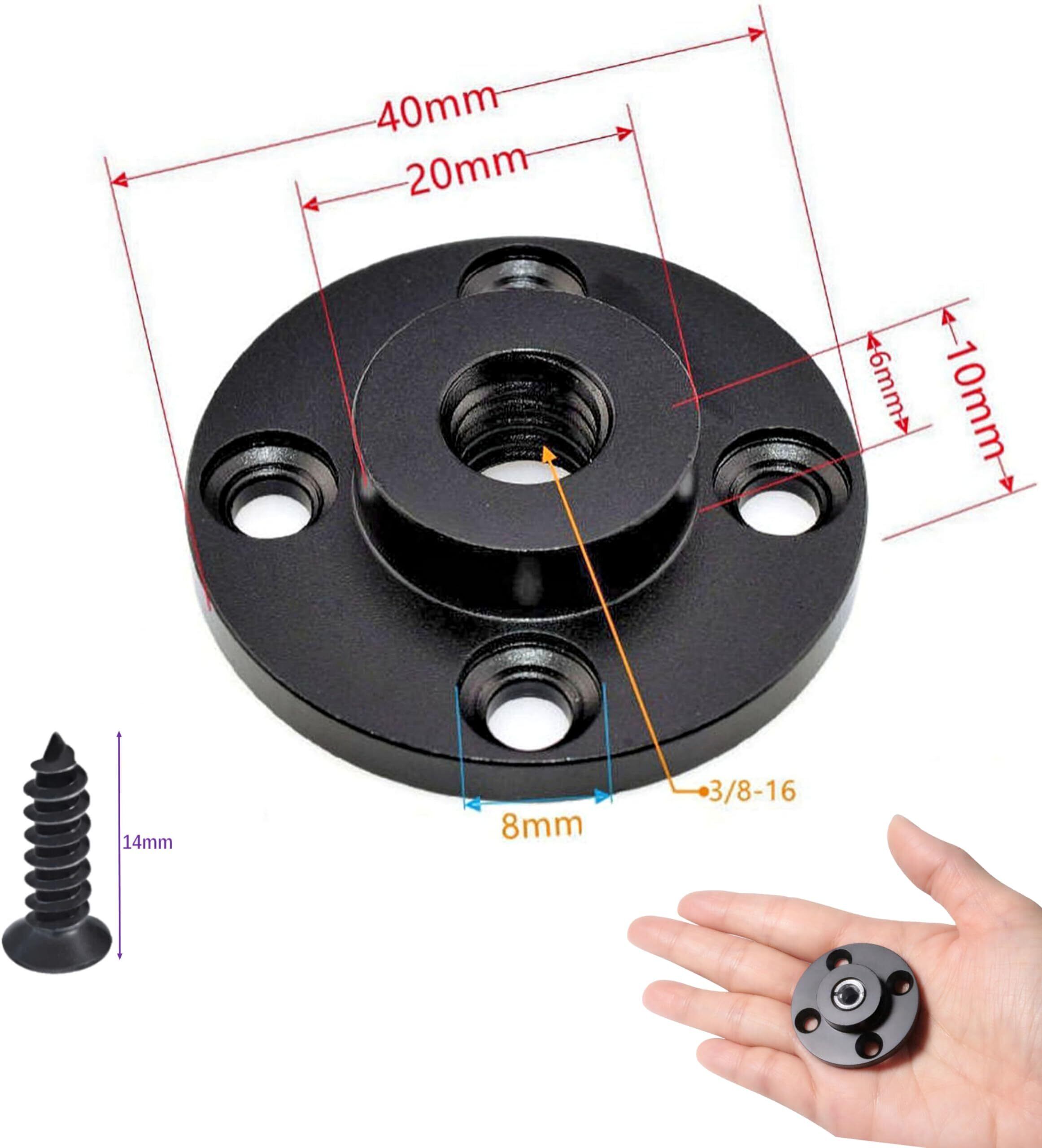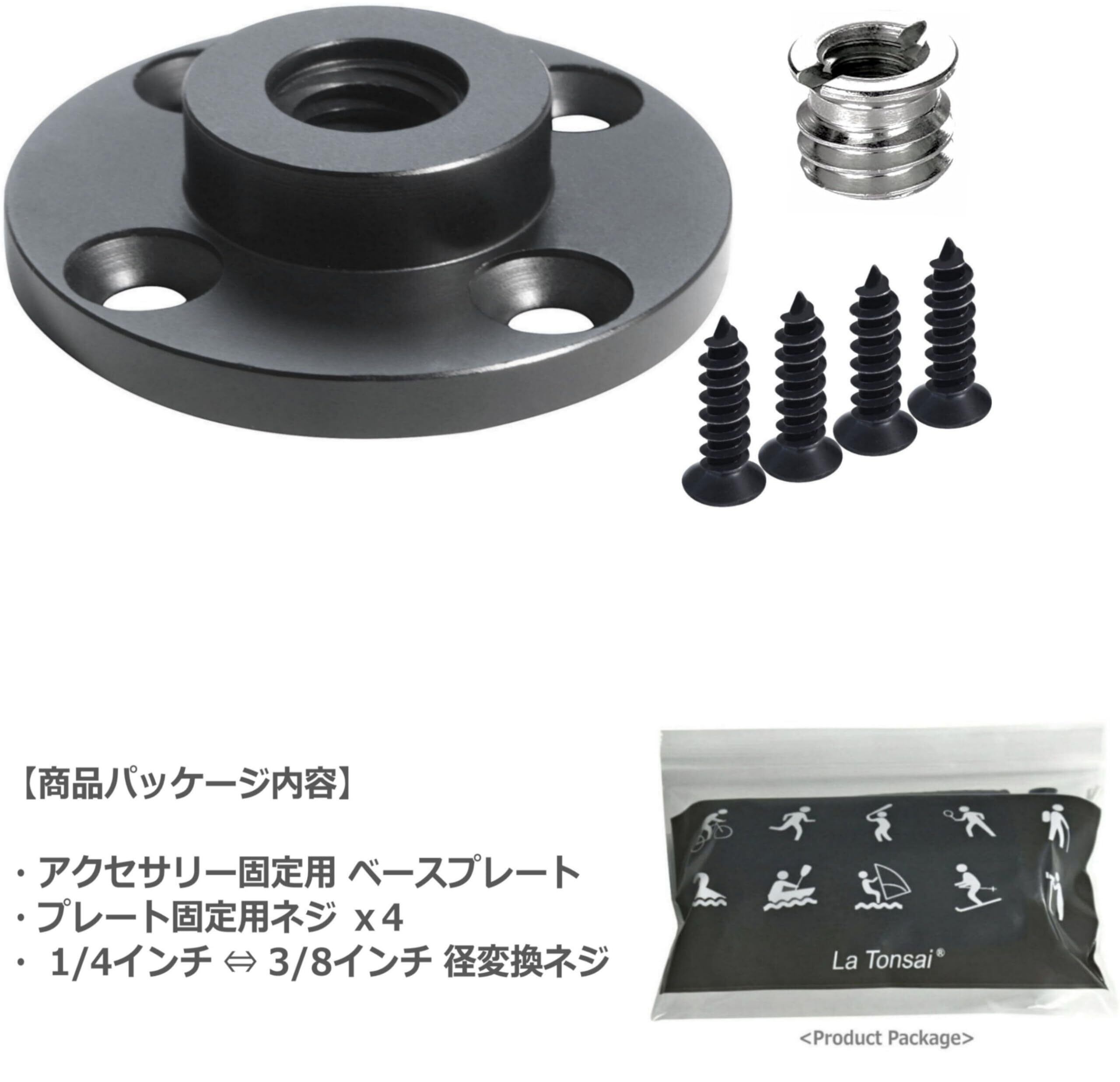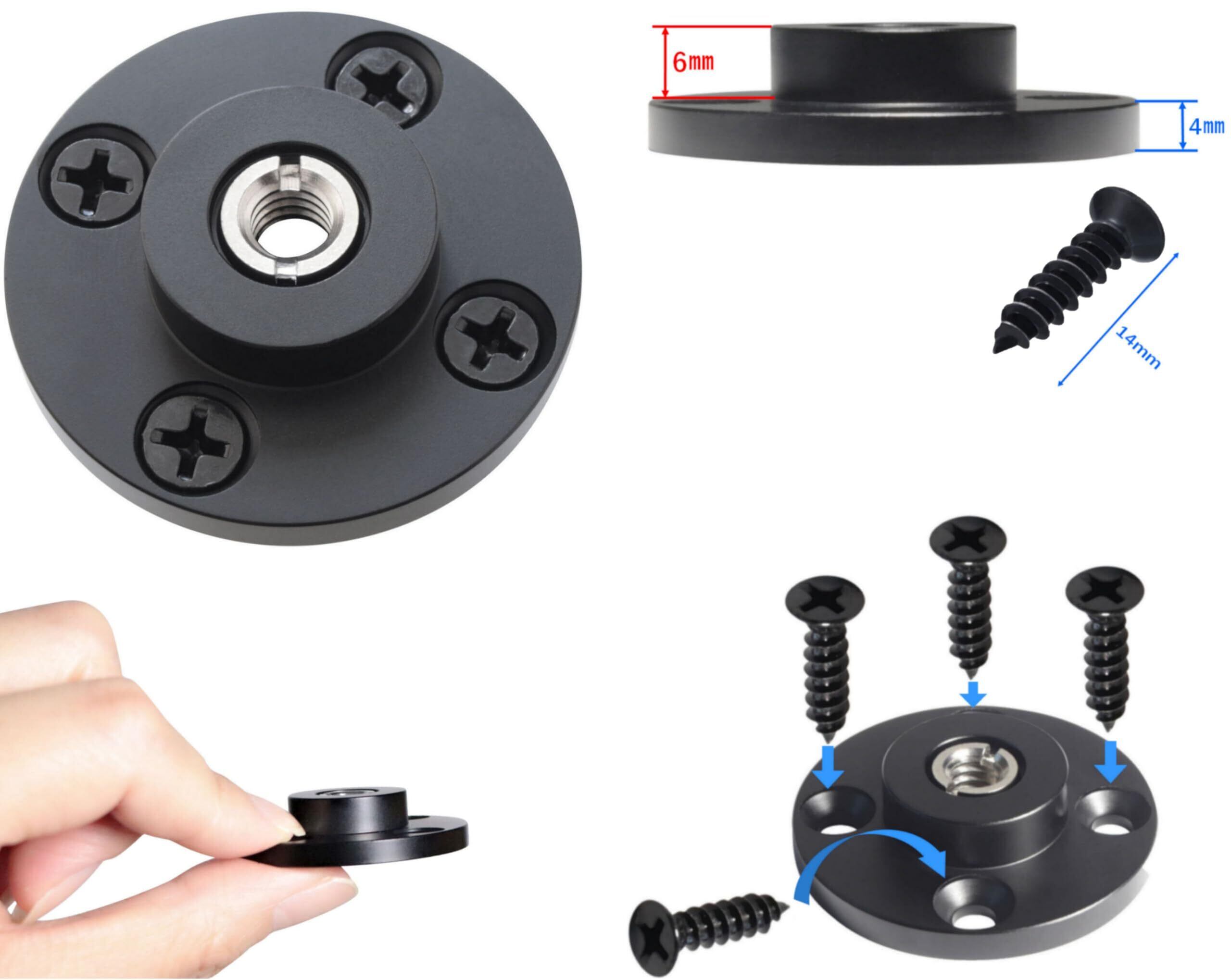 3/8 インチ、1/4 インチ のカメラ・ビデオ、ウェアラブルカメラ・アクションカム 撮影用アクセサリー類、CCTV・防犯カメラ、監視カメラ・Wifiカメラ、センサーライト、音響機器類、ダボネジ・スピゴット、マイク用スタンド・LED照明、ディフーザー、DIYデバイス、アクセサリー類に対応するネジ固定式ベースマウント 、ウォール アダプター プレートです。壁や天井、斜面など水平面でネジ締めが可能な場所に固定が出来ます。直径4㎝とコンパクトなサイズでスペースのない場所でも活躍します。