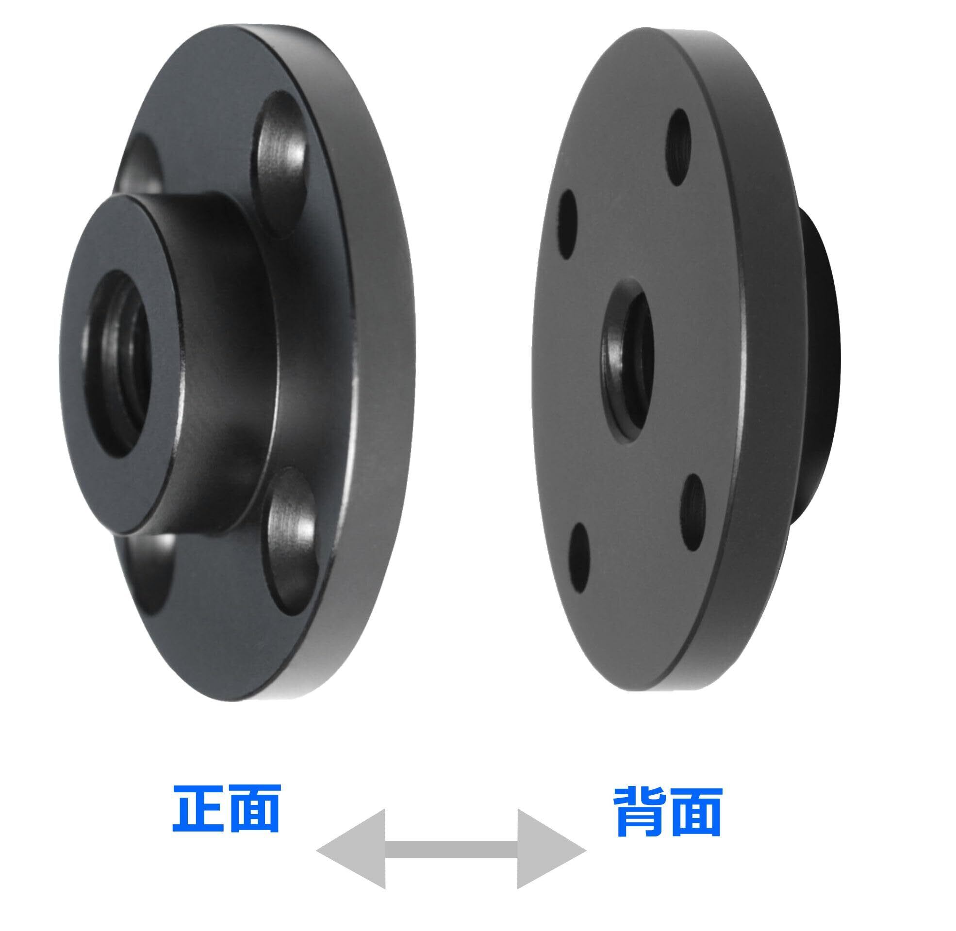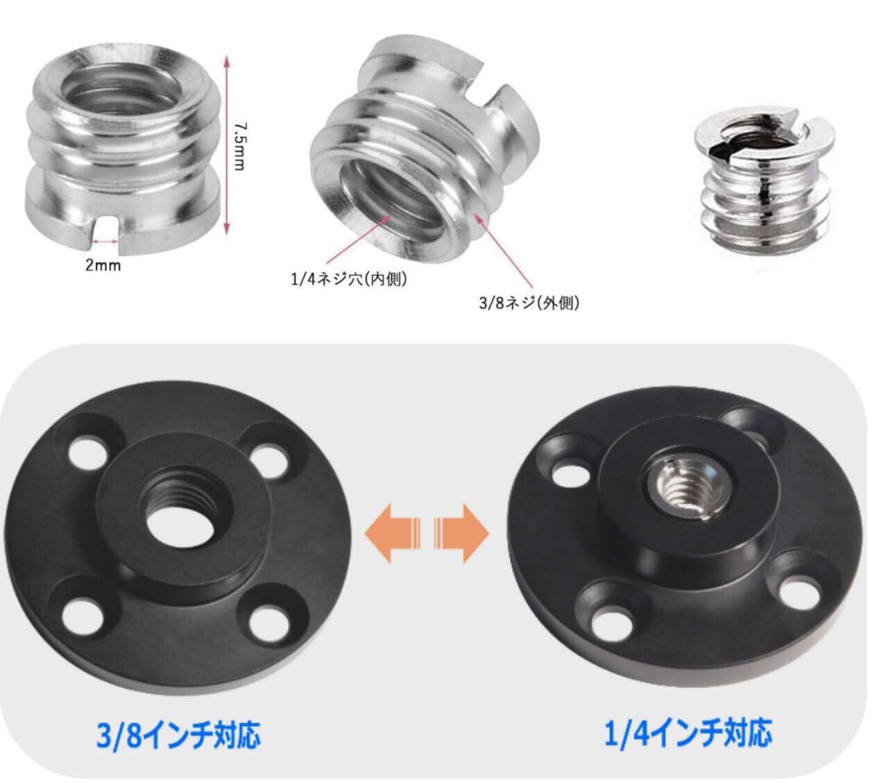固定プレート中央のネジ穴サイズは3/8インチの切り目、付属のネジ径変換アダプターねじ(コンバーター)を差し込めば1/4インチに対応します。別売のアダプターネジ(1/4-1/4, 1/4-3/8, 3/8-3/8;オス-オス, オス-メス)等を使用することで自由雲台・ボールヘッド、ティルト マジックアーム、チルト角度変更アダプターなどにも対応します。ウォールマウント、シーリングマウントとしての使用、室内・野外・屋外・作業現場、アウトドア、などロケーションを問わず写真や動画撮影での撮影機材の組み込みやスタジオ・音響機器の使用範囲が広がります。