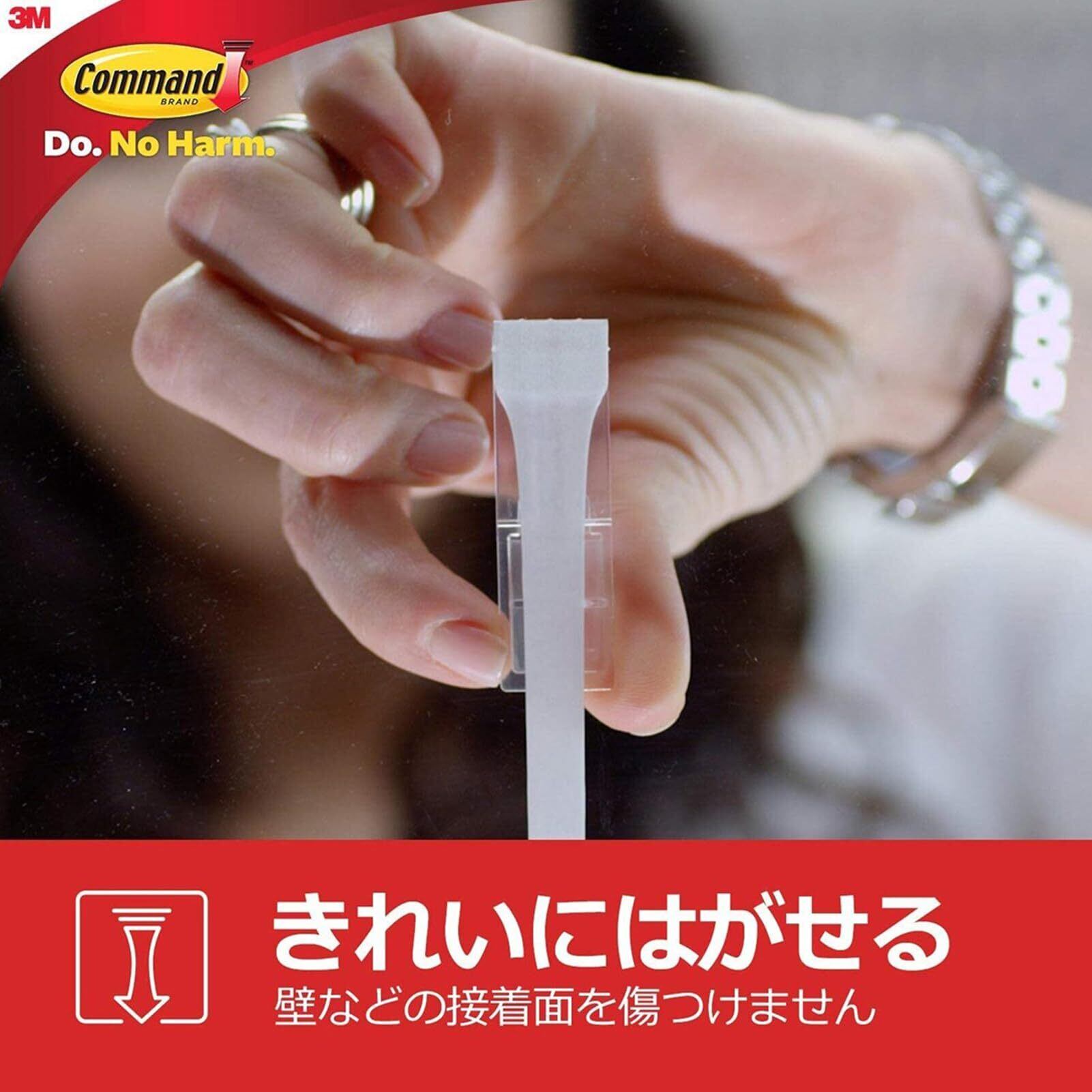 コマンドフック史上最大の耐荷重。シンプルでスタイリッシュなデザイン。幅広で奥行きのあるフック形状。取り付け面を傷めることなく設置でき、不要になったり移動する時はきれいに取り外せる。タブをゆっくり引き伸ばせば、のりを残さずきれいに、はがせる。はがしたフックは、粘着テープ(タブ)を取り替えて再利用できる。強力なフックなので、バッグやランドセル、リュック、カバン、厚いコート、荷物の一時置きや備品などの収納に便利。(耐荷重6.8kgまで)壁紙には使用できませんのでご注意ください。また、壁の素材によっては十分な耐荷重が得られない可能性があります。また、化粧シート構造の壁や表面の状態によっては、傷める場合がありますのでご注意ください。