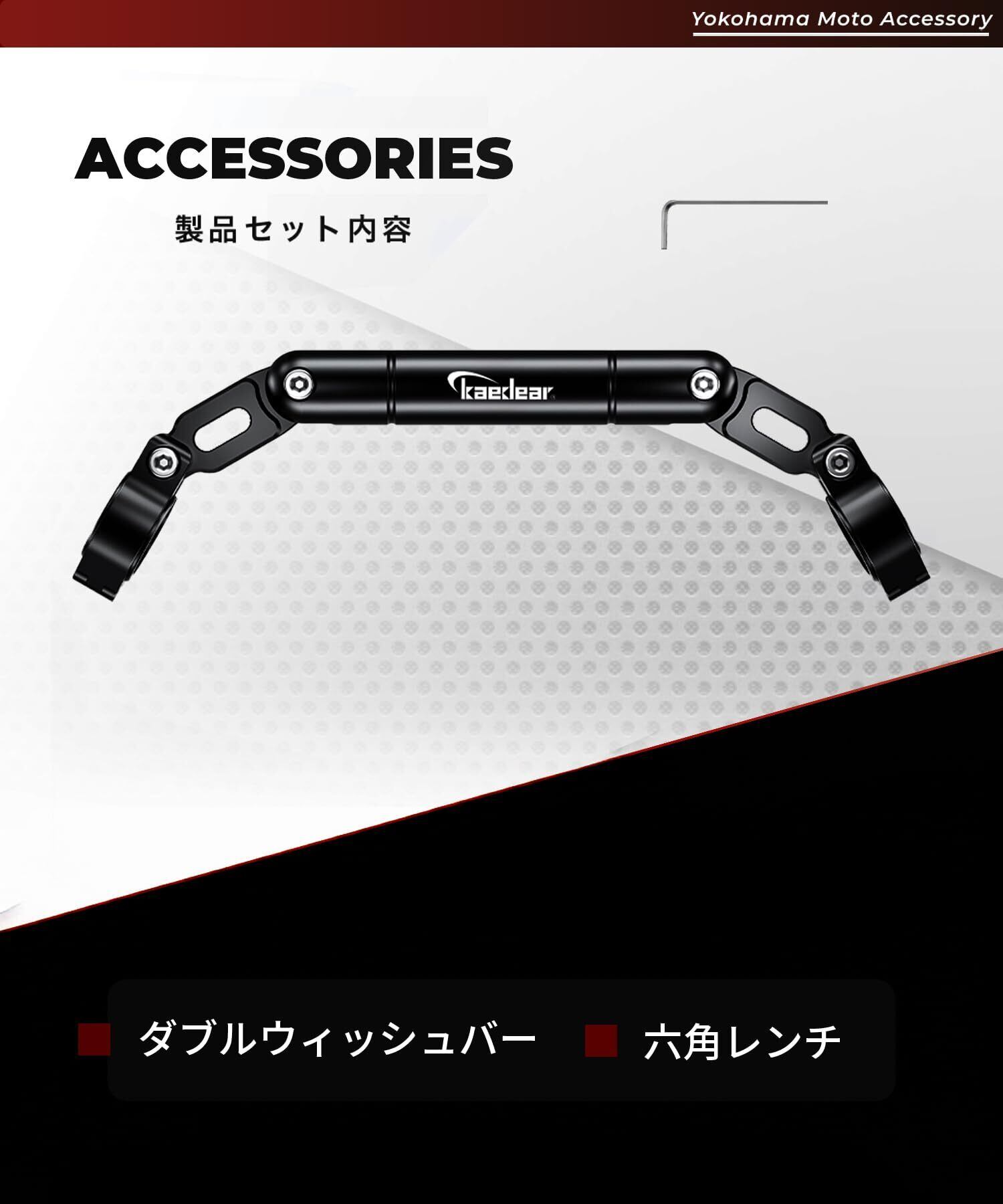 【商品詳細】 ■サイズ:取り付け径22mm、バー径22mm バー長さ:110mm、アーム長さ:43mm、全長160~235mm ■重量:186g ■材質:アルミニウム合金 ■内容:ダブルウィッシュバー一式、22mmアタッチメント、六角レンチ、取り扱い説明書