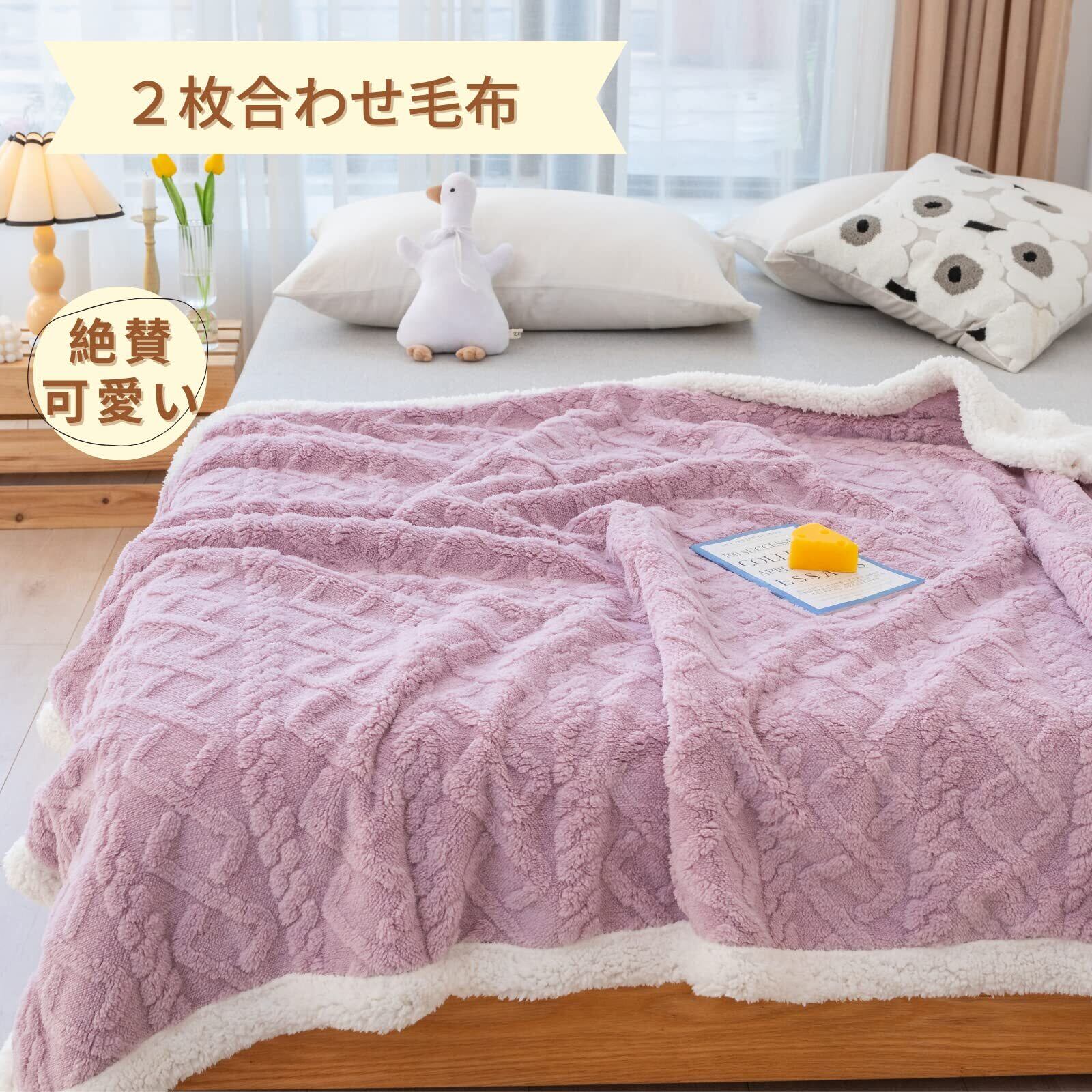 Mokoya 毛布 シングル 冬 厚手 130×160cm 2枚合わせ ブランケット 北欧風ボア 可愛い 膝掛け 大判 軽量掛け毛布 抗菌防臭 防ダニ 静電抑制(ラベンダー)