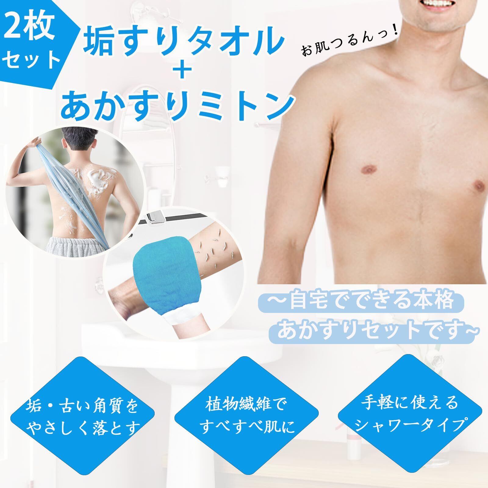[Senteria] 垢すりタオル あかすり ミトン お風呂手袋 2点セットブルー 肌に優しい 角質取り 両面の血行促進 体臭ケア 繰り返し使用 泡立ち ボディタオル ハード 腕 背中 足 脚 男女兼用 お風呂 浴用 手袋 入浴用品 ギフト プレゼント 贈り物 | hananoki