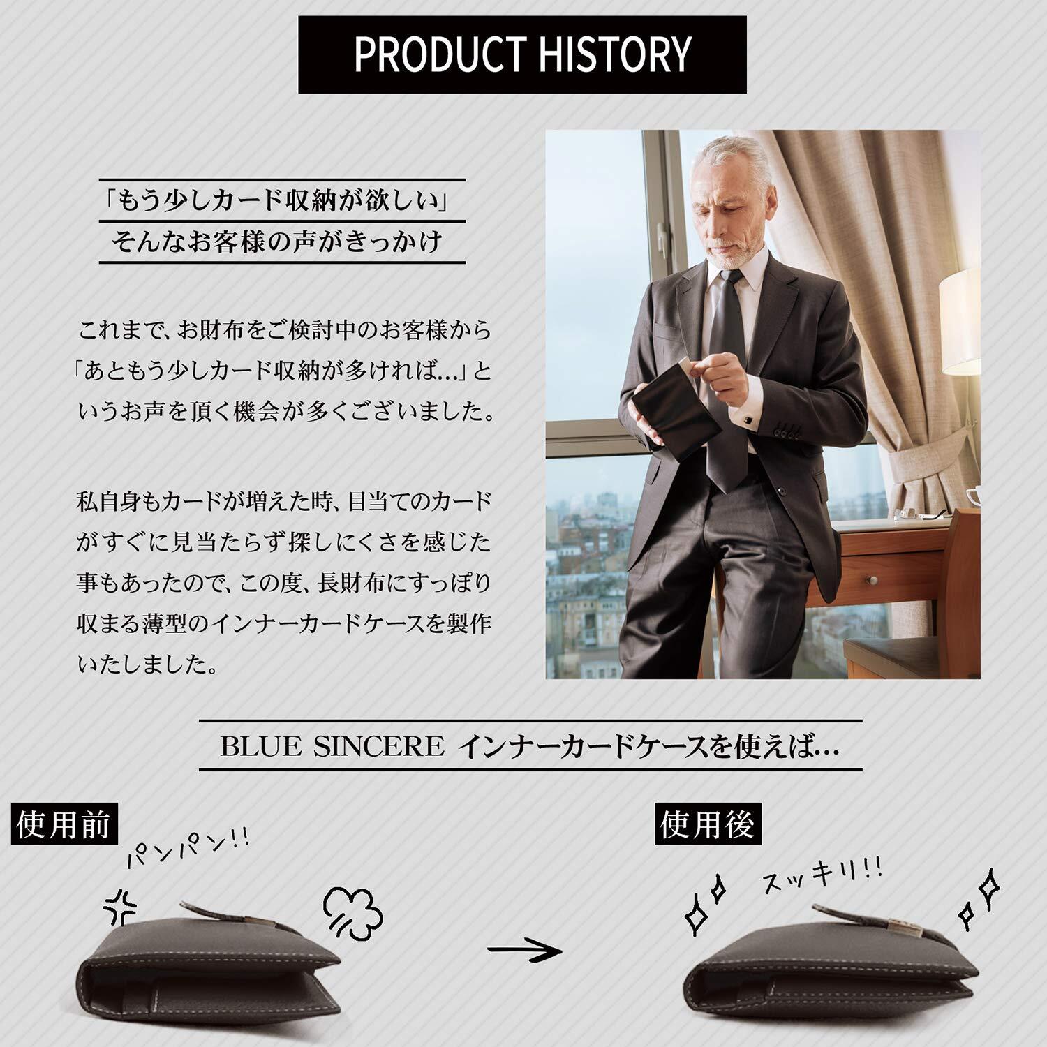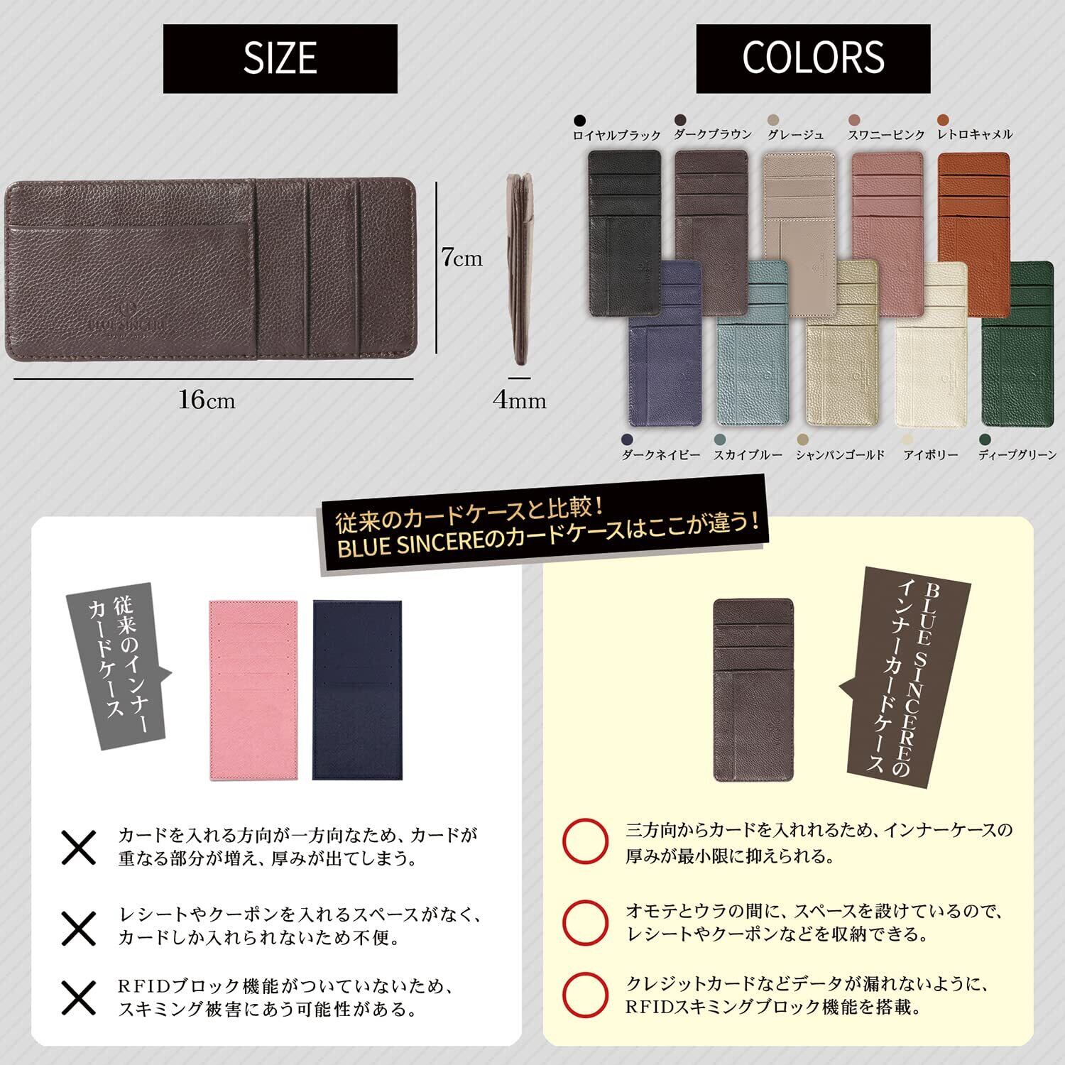【 こんなお悩みありませんか? 】 「今使っている財布はデザインは気に入っているけど、カードの収納スペースが少ないから増やしたい…」「カードやレシートで財布がパンパンに膨らんでいる…」「カードのデータを守りたい…」こんなお悩みありませんか?一つのカードポケットにカードを複数入れて財布がパンパンになっていませんか?カードがスッキリ収納できていなくて、レジ前でカードを必死に探していませんか?今の時代、自分の個人情報は自分で守りませんか?これらのお悩みはBLUE SINCEREのインナーカードケースで解決できます。これであなたのお財布もスッキリします。 【 お客様のお声から誕生しました 】 「もう少しカード収納が欲しい…」「インナーカードケース自体が膨らむのがイヤ…」そんなお客様からのお声を聞き、収納だけでなく使いやすさも徹底追及したインナーカードケースが誕生しました。カードの収納枚数は、バランスの良さを考えて9枚にしました。必要なカードがパッと見えて分かりやすい構造なので、レジ前でもサッと見つけられます。また、カード同士が重なりにくい3方向構造にしたので、カードケース自体の膨らみも抑えました。それだけでなく、3方向からカードを出せるので、取り出しやすさも実現しました。これで財布の中身もスッキリでき、財布がパンパンになるということも無くなります。 【 レシートもスッキリ収納! 】 レシートや貰ったクーポン券などを財布に入れておくと財布の中がいっぱいになってしまいますよね。財布の中でレシートがぐちゃぐちゃになっていると、見た目も悪くなってしまいます。そんなレシートやクーポン券をスッキリまとめられるよう、レシートポケットを真ん中に付けました。ここにレシートやクーポン券を入れておくことでスッキリします。また、レシートだけでなくお札も入れられるので、これを財布代わりに持ってお出かけすることもできます。 【 長く使える本革素材 】 素材には最高級シュリンクレザーを贅沢に100%使用しています。長く使えば使うほどカードに馴染み、あなただけのインナーカードケースに育てられます。 【 セキュリティ面もバッチリです 】 キャッシュレス化が進み、現金を持ち歩かなくてもカードだけでお買い物ができる便利な時代になりました。ですが、犯罪の手口も多様化されて来ており、知らないうちにクレジットカードの情報を読み取られて悪用されてしまう、という犯罪も増えています。そんな恐ろしい犯罪からあなたの個人情報をしっかり守れるよう、カードケースの素材にはクレジットカードから発せられる電波を遮断できる「RFIDブロッキング専用フィルム」を織り込みました。インナーカードケースの中にクレジットカードを入れておけば、電波を遮断できるのでスキミングされ、「知らない間にクレジットカードを利用されていた。」ということを未然に防ぎます。スキミング防止機能の付いたインナーカードケースで、あなたの大切な個人情報をしっかり守ります。 【 サイズ 】 16㎝ × 7㎝ × 4㎜ 重量:33g 【 カラー 】 ロイヤルブラック・ダークブラウン・ダークネイビー