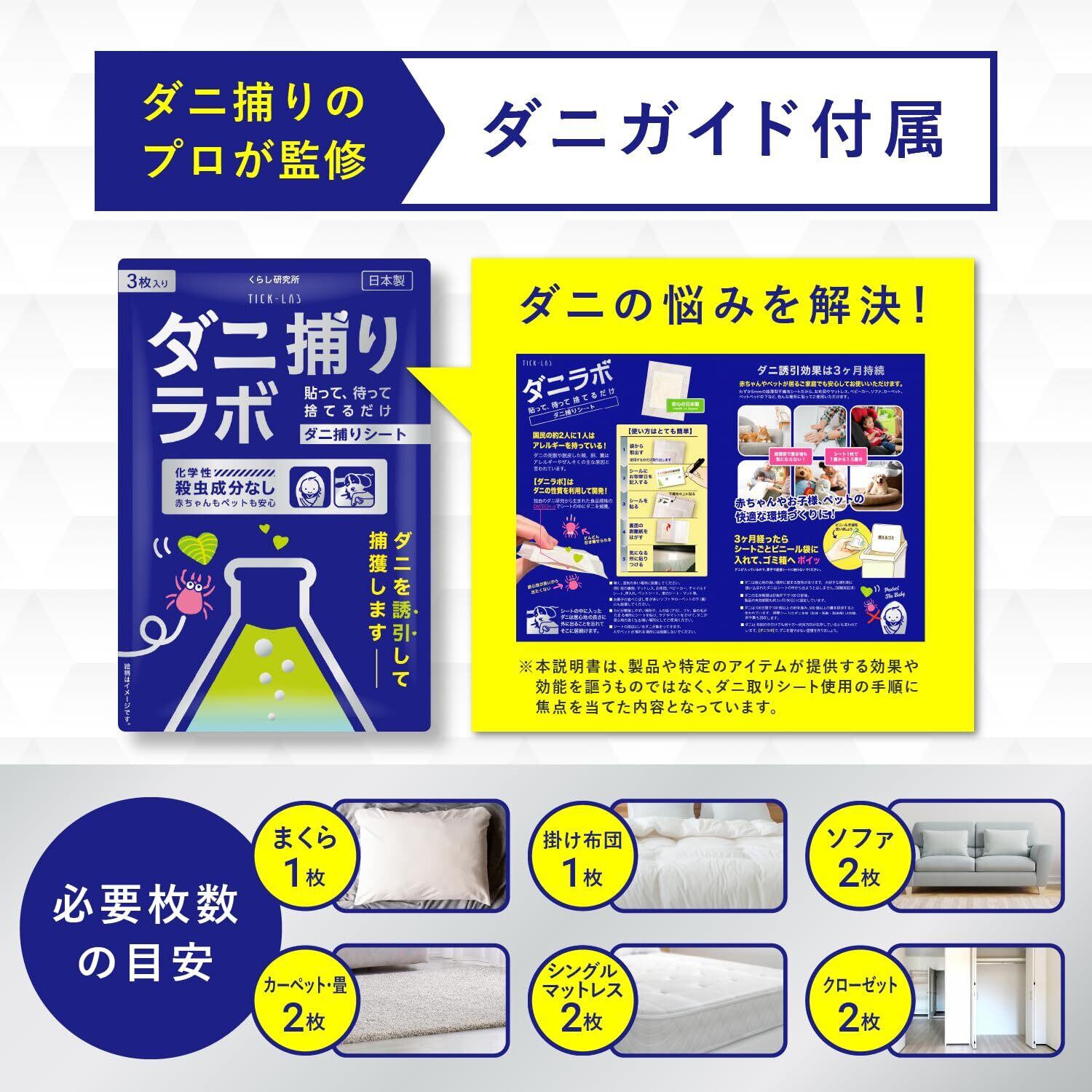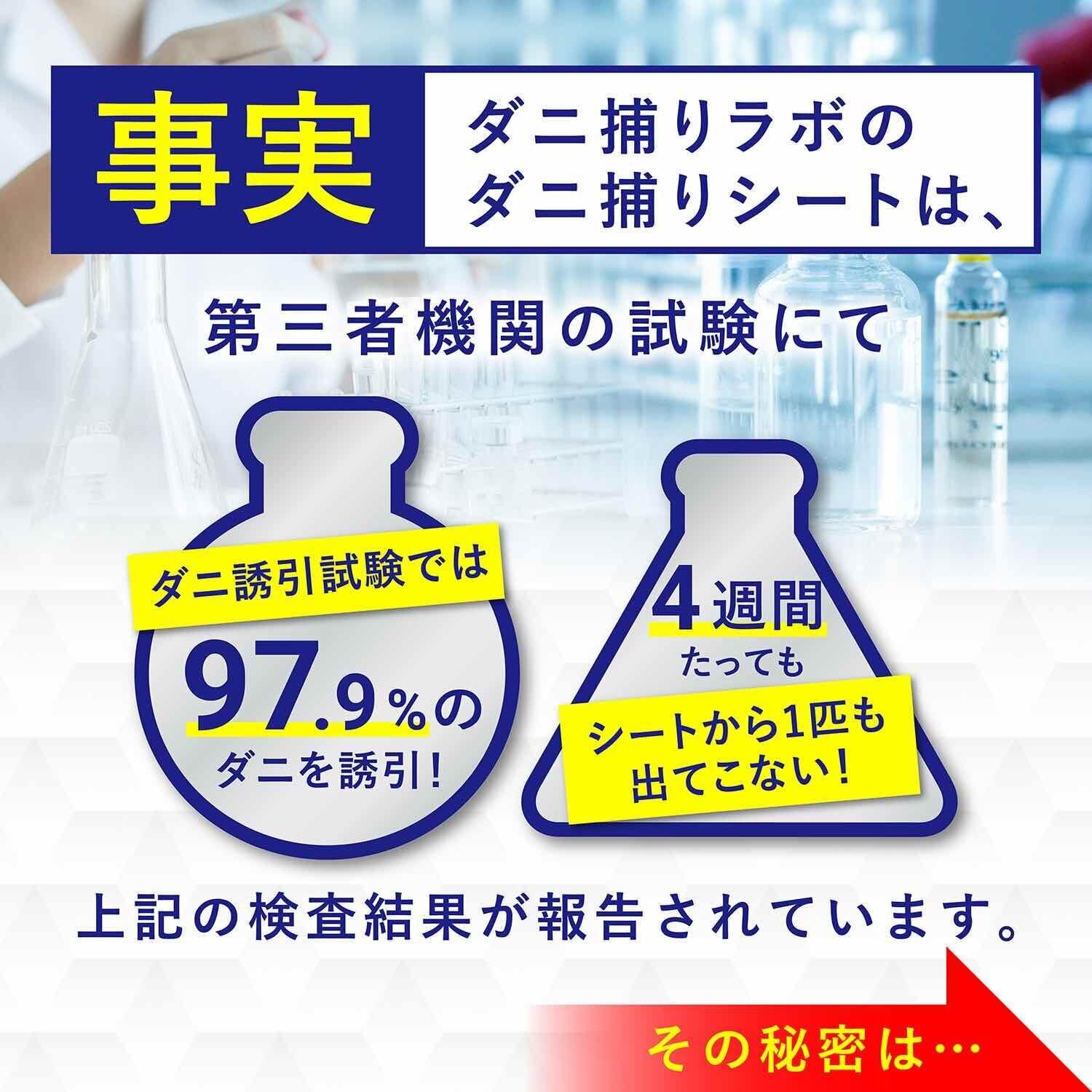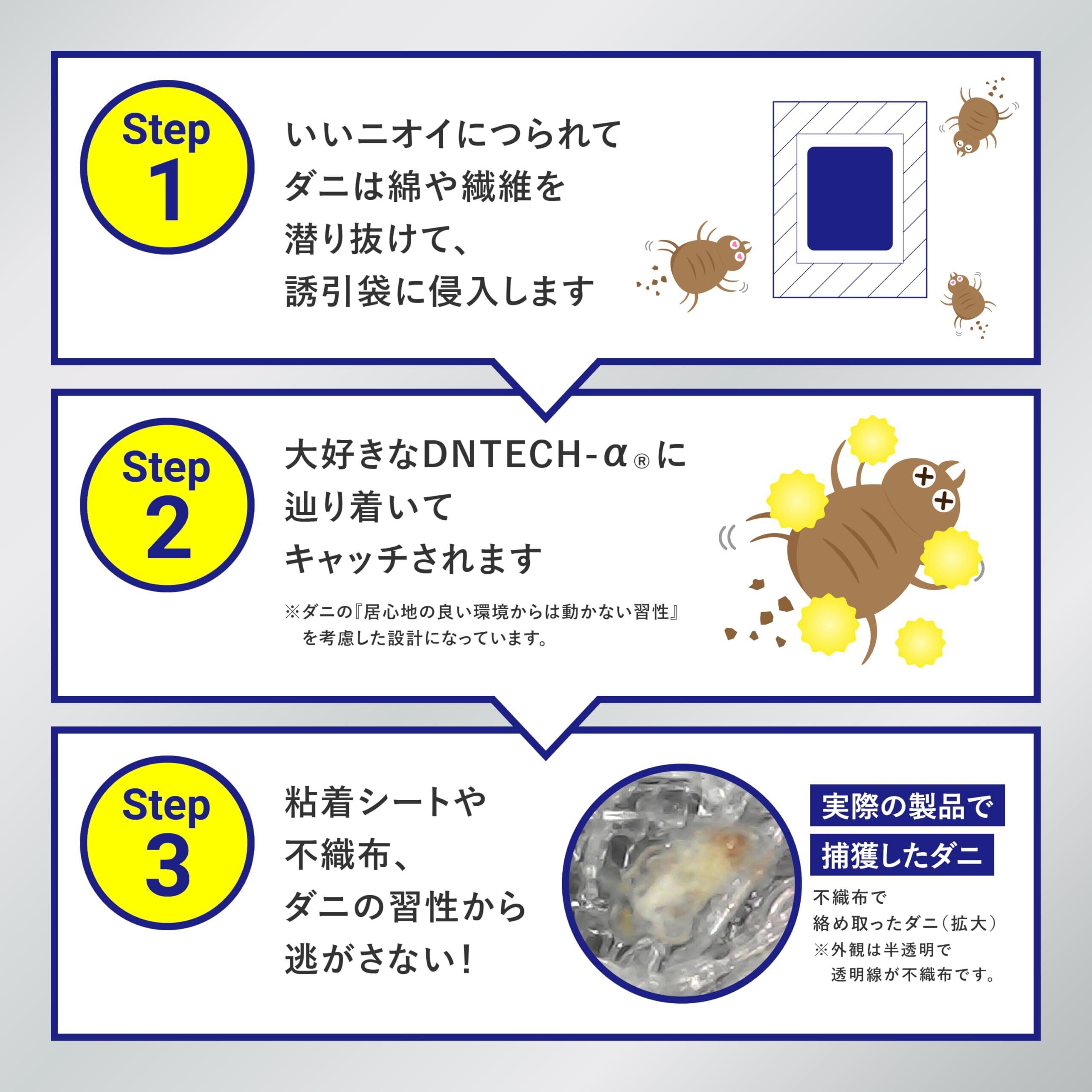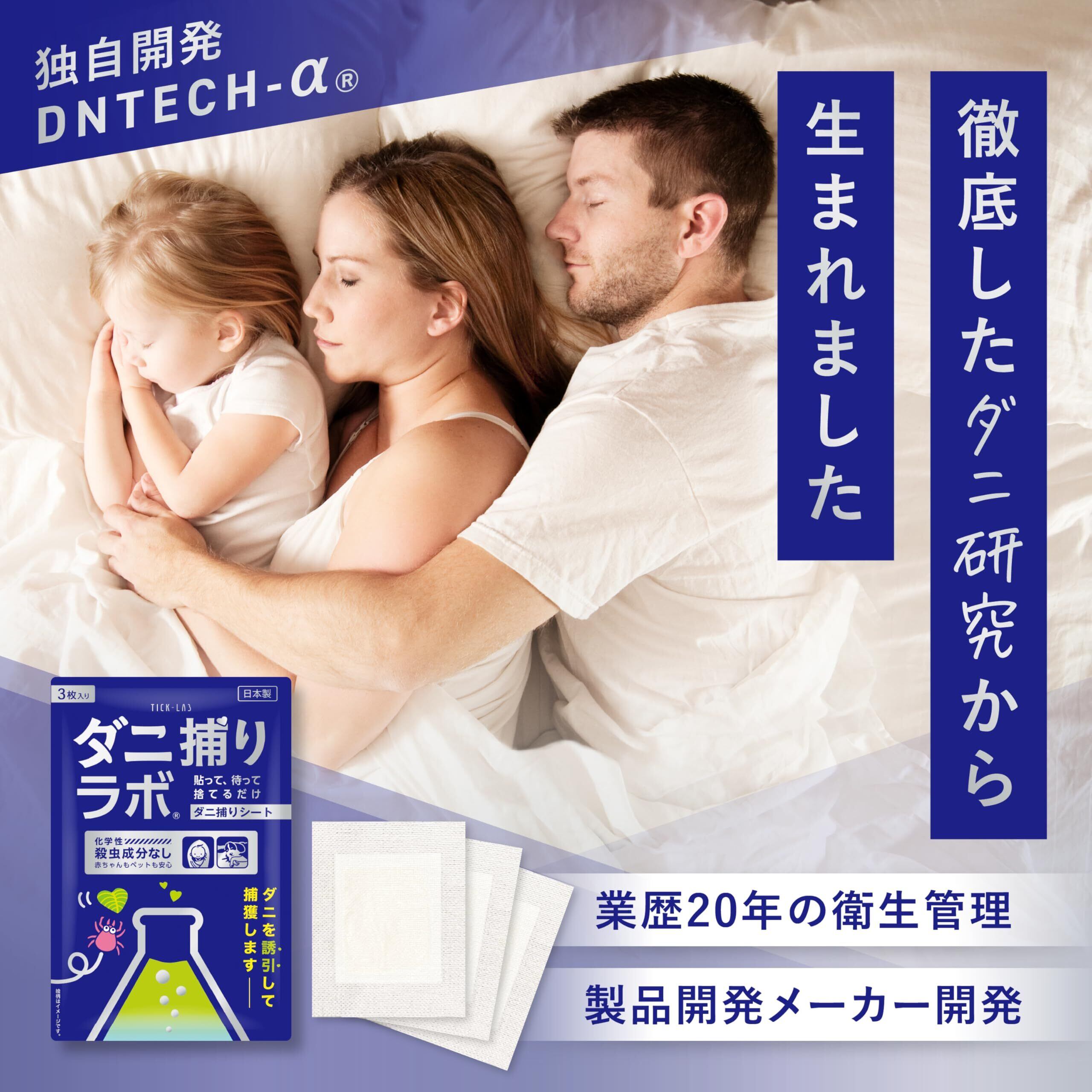 業歴20年の衛生管理製品開発開発。独自開発のDNTECH-αがダニを大量に誘き寄せ、ダニ取りシートにダニを誘引。ダニの居心地の良いところから離れない習性を利用して逃がしません。化学性殺虫成分を一切利用していないので、子供やペットにも安心安全です。