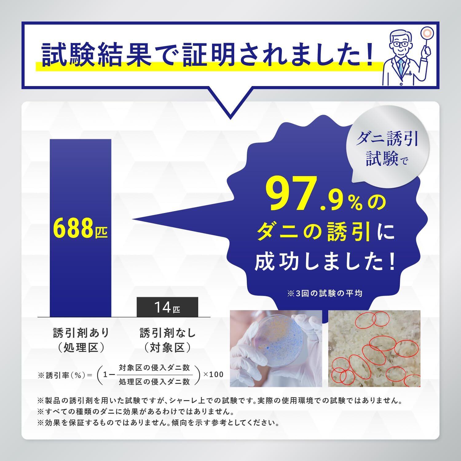 ダニの誘引試験では97.9%のダニの誘引に成功。ダニシートから放たれるDNTECH-αがダニを誘き寄せます。国内ダニトリシートトップレベルの誘引力です。匂いは設置しても気にならない匂いで、日々の生活もストレスフリーで過ごすことが可能です。