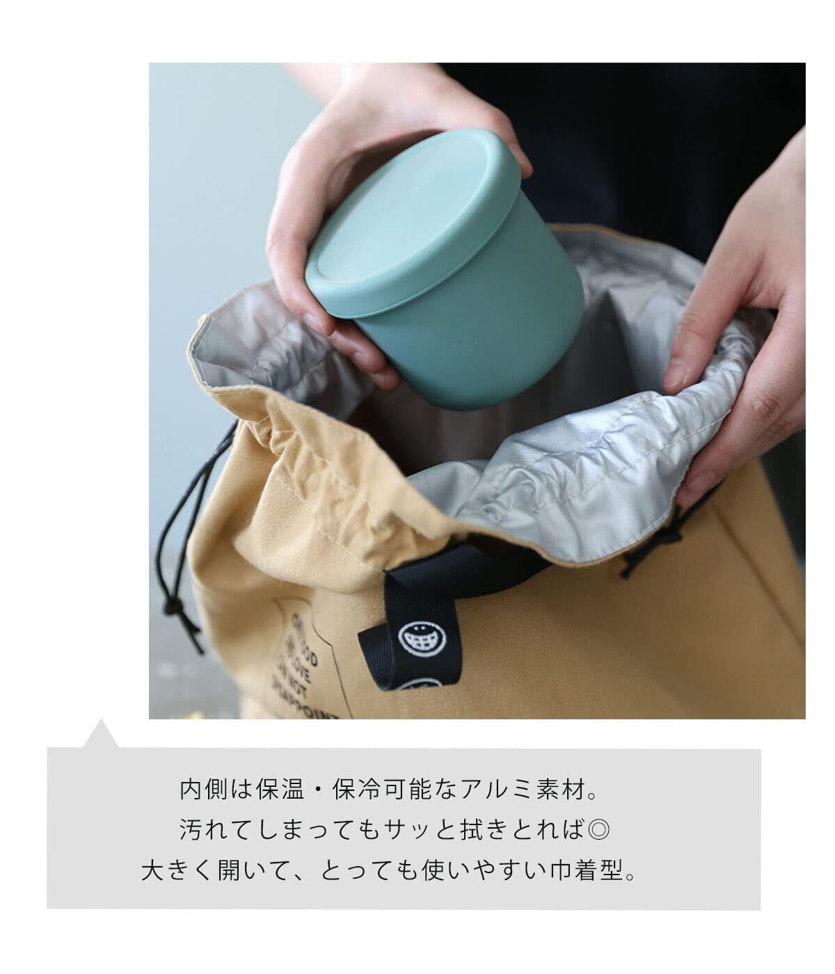 【保温・保冷】で安心のランチバッグ。 大きく開いて、とっても使いやすい巾着型。 バッグの中に入れるのはもちろん、 オシャレなシンプルデザインなので手持ちで使っても◎内側は保冷・保温のアルミ素材。 汚れてしまってもサッと拭き取れて衛生的です。 大きめ設定で「しっかりマチあり」 幅広マチなので、しっかり自立◎ スープジャーや1000mlのお弁当など見た目以上にたっぷり入ります。