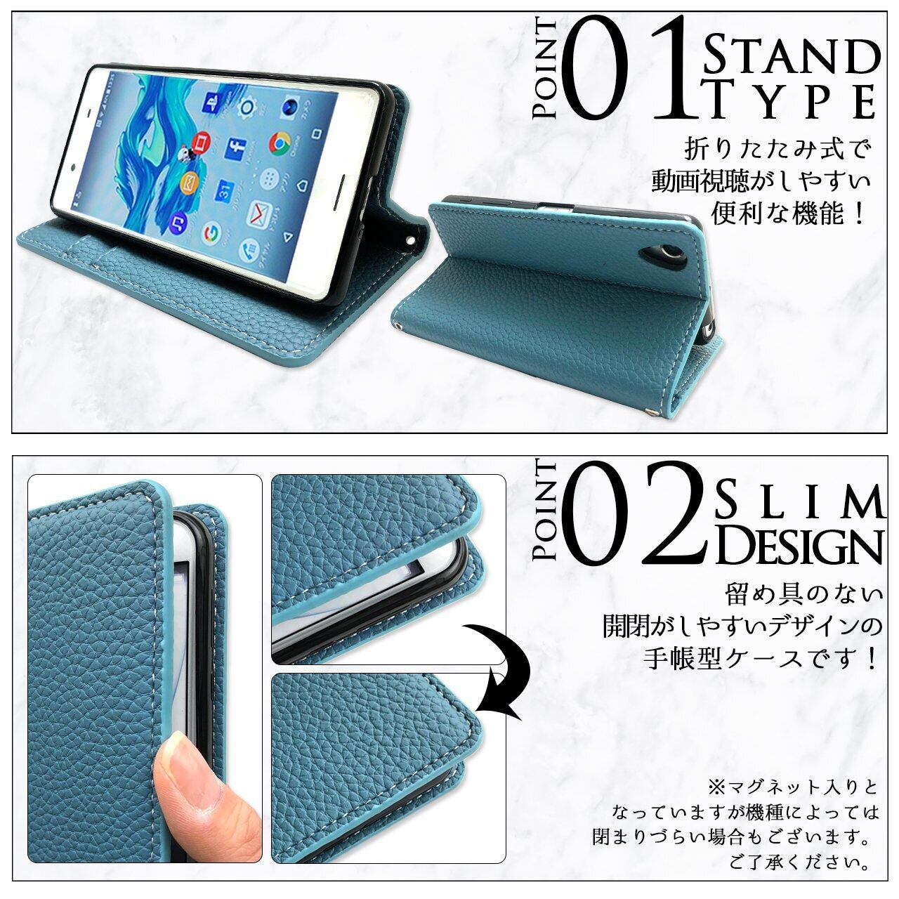 機種に合わせた開口部が開いております。※電源ボタン等はケースの上から押す仕様となっております。ご了承ください。手帳型ケースはスマホ本体より大きめの作りになっております。