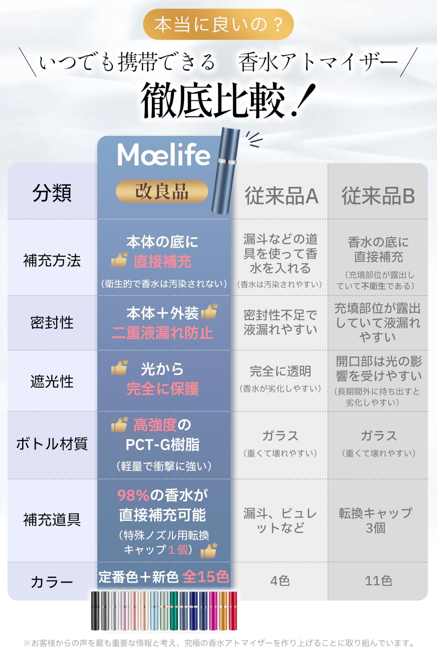 【超簡単・詰め替え方法】STEP1:香水瓶のノズルを抜きます。STEP2:本体を軽く回して、気密性を緩めた後、スムーズに引き抜きます。STEP3:本体の底をノズルにセットして押し出します。新しいアップグレードにより、直径2~3mmまたは3~5mmの直円形ノズルを持つあらゆる香水瓶を直接詰め替え可能です。特殊ホーン状や傘状のノズルにも、付属転換キャップで対応します