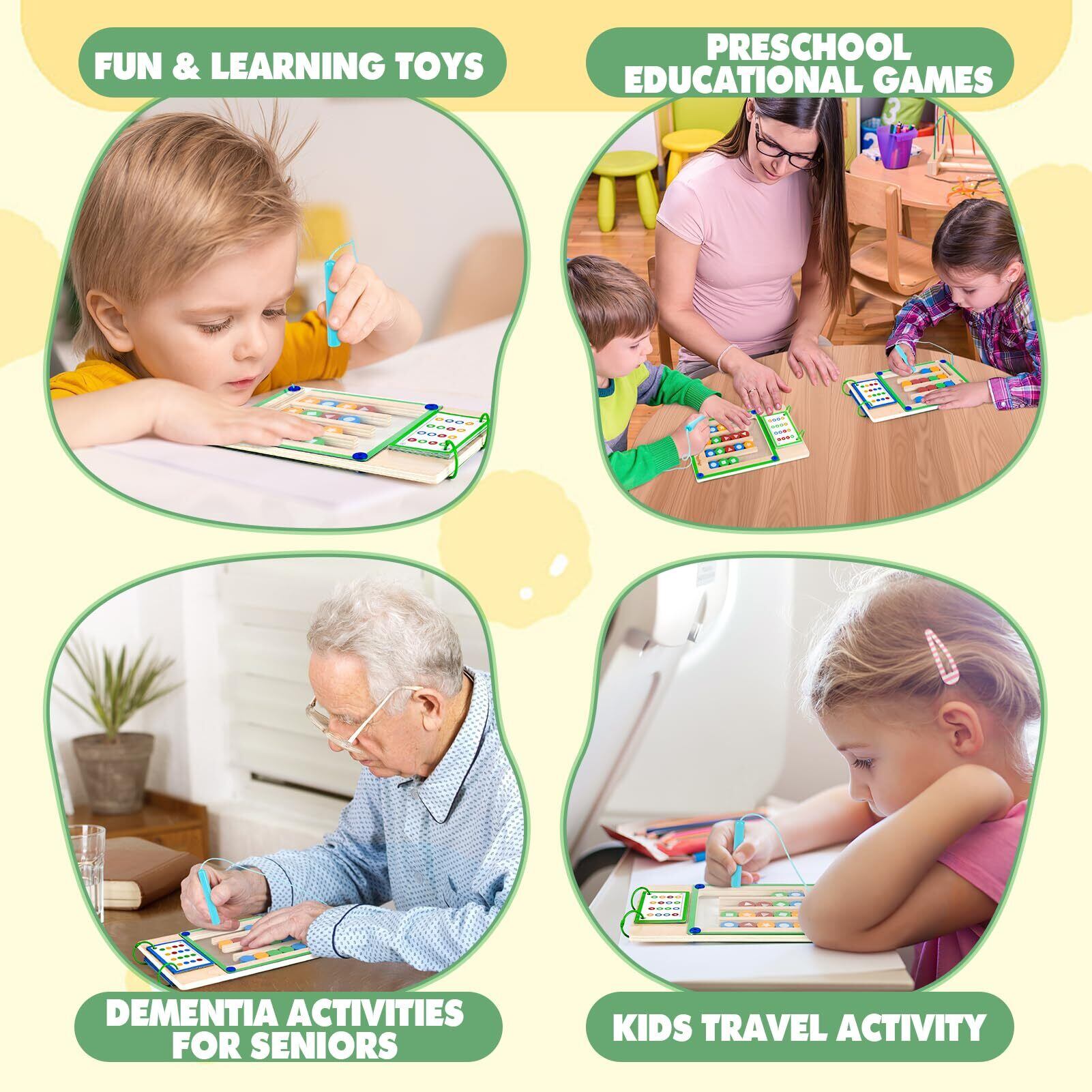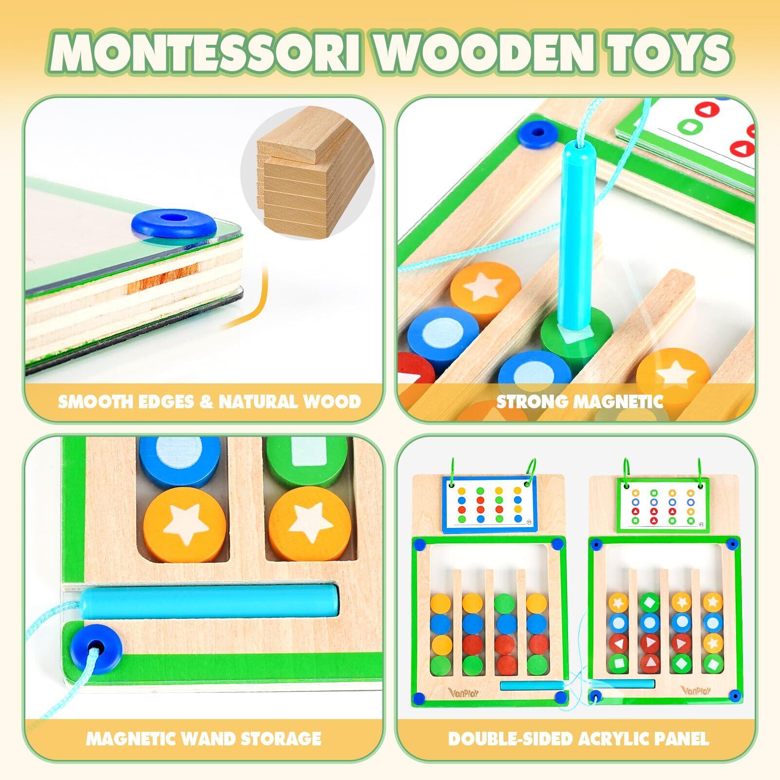 【安全で耐久性のおもちゃ】滑らかなエッジの天然木素材でできており、コンパクトで軽量です。 すべての木製ブロックは、透明アクリル板の下にしっかりと封入され、脱落を防ぎます。 マグネットペンは、紛失を防ぐため、紐でマグネットボードに固定されています。 カードはループファスナーでボードに固定され、遊びながらページをめくることができます。
