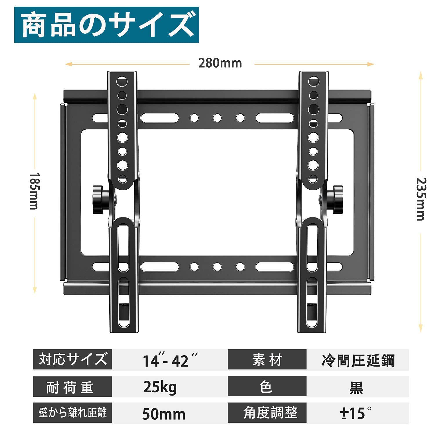 TETVIK テレビ壁掛け金具 小型 軽量 14-42インチ 上下角度調節可能LCD LED 液晶テレビモニター用 対応VESA規格250X210mm 耐荷重25kg ティルト壁掛けTV金具