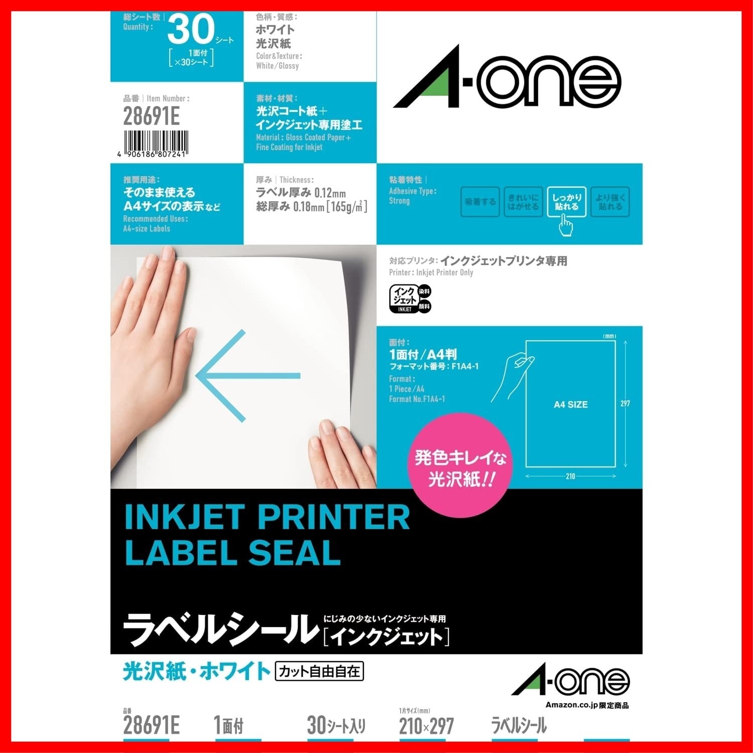エーワン ラベルシール 光沢紙 インクジェット A4 ノーカット 30シート 28691タイプ