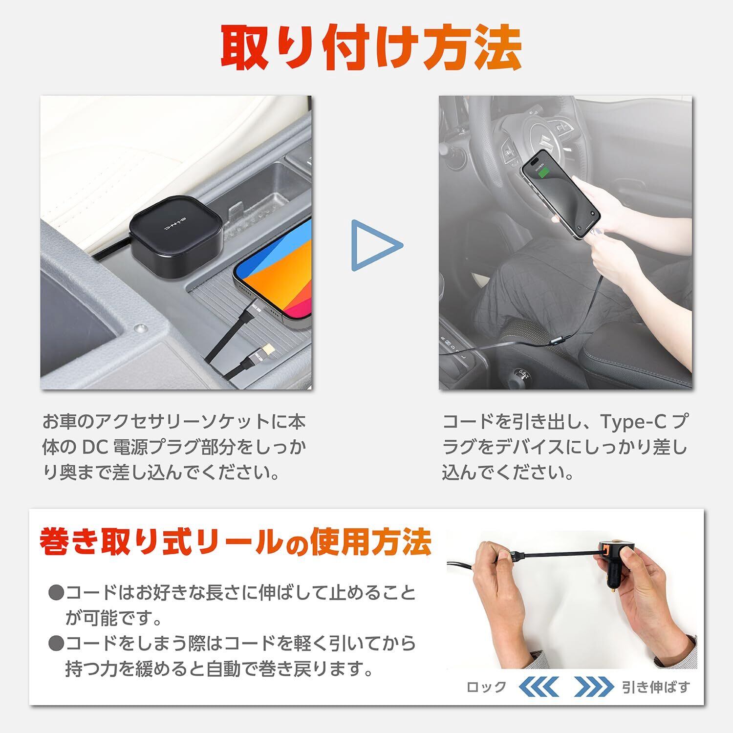 車のアクセサリーソケットから充電を行えるリール充電器です。