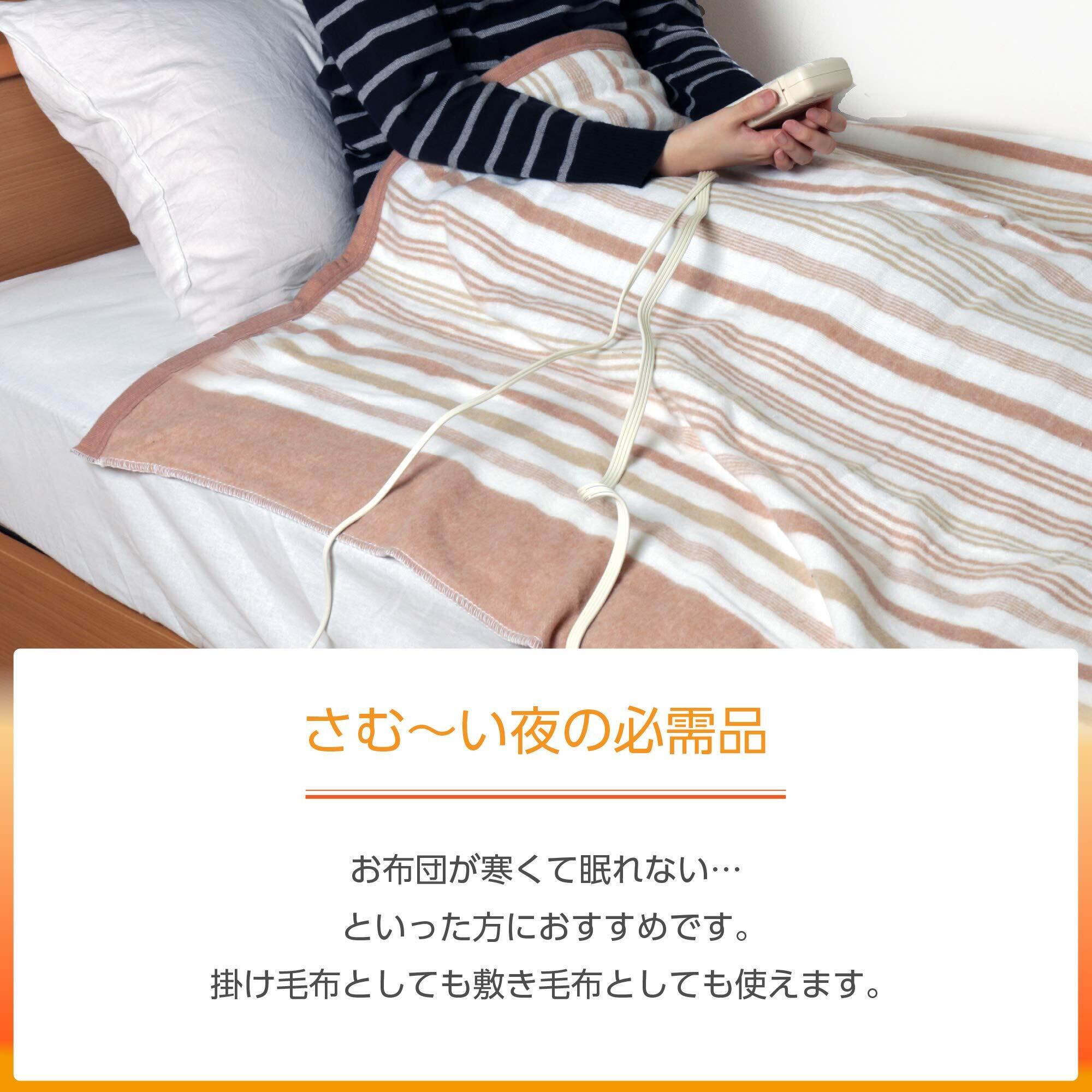 【温まる範囲について】こちらの電気毛布は、頭側から38cm、足側から30cmには電熱線は入っておりません。電熱線が入っている部分は中央部分になります。なぜ電熱線が入っていない部分を多くしたかというと、寝ている間に毛布がずれてしまうことがないように電熱線が入っていない部分を布団に折り込み、ずれにくくするためです。また、折り込まなくても温まらない部分の面積を増やすことによって、寝返りをうっても毛布がずれにくくなるという効果もあります。敷き毛布として使った場合では、身長160cmの方でおよそ足先から胸までが温まります。掛け毛布として使った場合には、身長160cmの方でおよそ足先からお腹までが温まります。※個人差があります。下半身を重点的に温めたい方におすすめします。