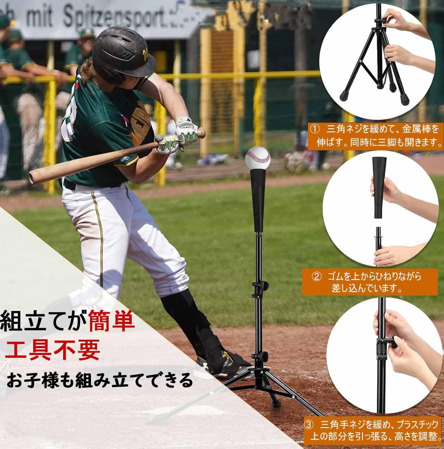 【組立て簡単】このバッティングティーの組立ては簡単。ボール置きゴムをスタンドの上に差し込んでから、中部二つ三角手ネジでスタンドの高さを調整します。工具など一切不要です。子供一人も組立て来ます。