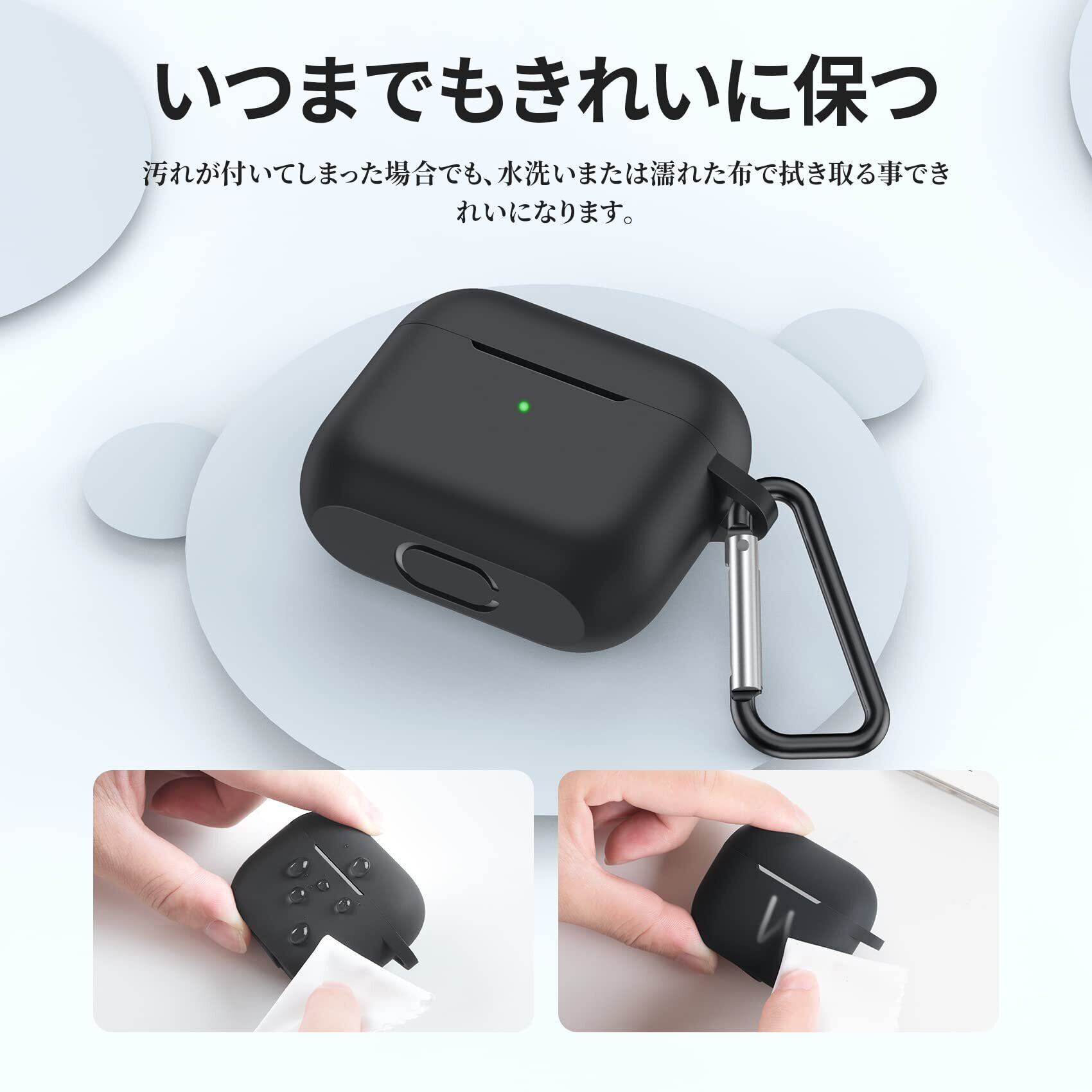 【しっかり保護】衝撃を吸収できる高品質シリコン素材を採用することで、触り心地が良いだけでなく、優れた保護力を発揮します。お使いのAirPodsを落下による衝撃や擦り傷からしっかり保護します。また柔軟性も高く、汚れや指紋がつきにくいです。少し汚れがついてしまった場合でも、水洗いまたは濡れた布で拭き取ることできれいになります。