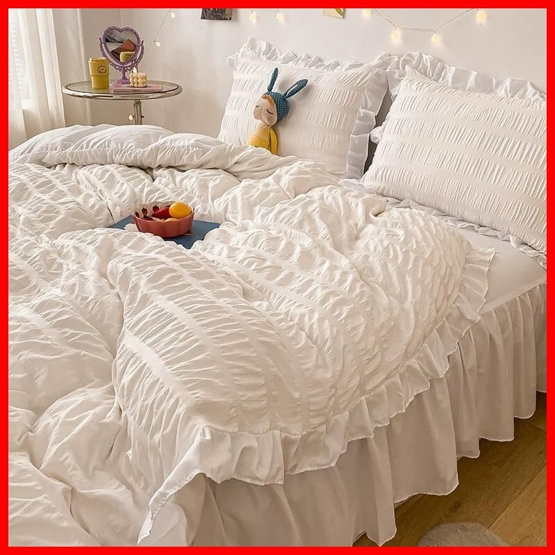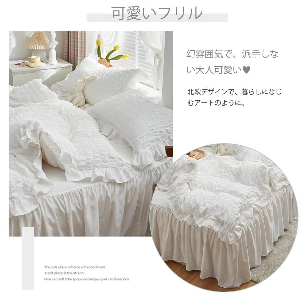 布団カバー 3点セット 4点セット フリル付き布団カバー 寝具カバー 洋式・和式兼用 ベッドカバー 掛け布団カバー ボックスシーツ 枕カバー シーツカバー 肌に優しい ピーチスキン加工 北欧風 四季通用 (シアサッカーホワイト, 3点セット*シングル)