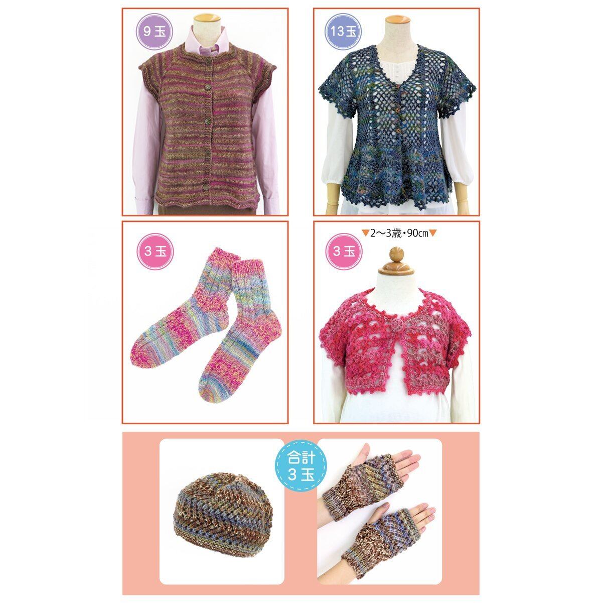・標準使用糸量目安(メリヤス編み):婦人用プルオーバー15玉