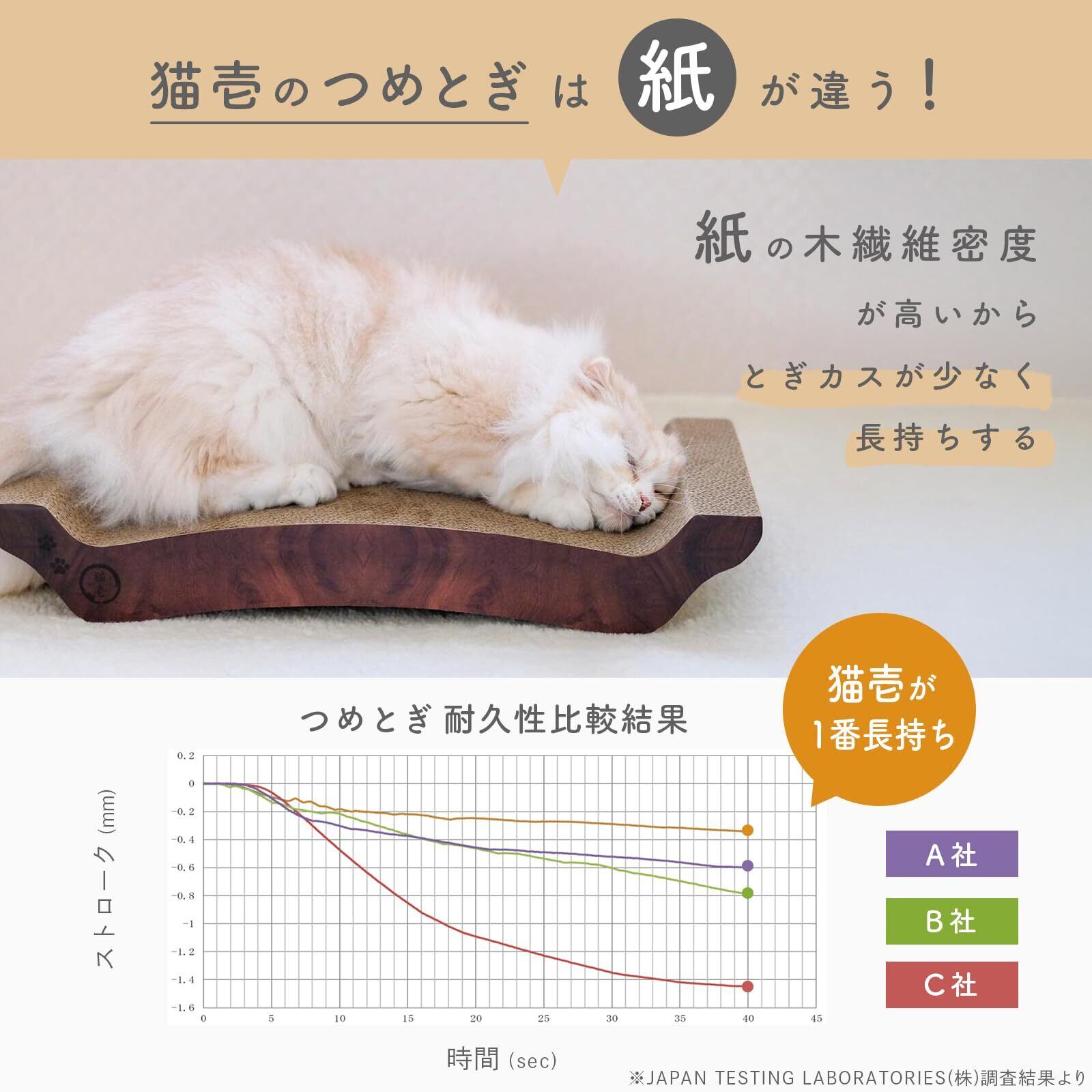 【高密度ダンボールで長持ち】ダンボールは薄いダンボールを貼り合わせています。薄いタイプを使用することで密度が高くなり、猫のとぎ甲斐アップだけでなく、耐久性も持たせています。