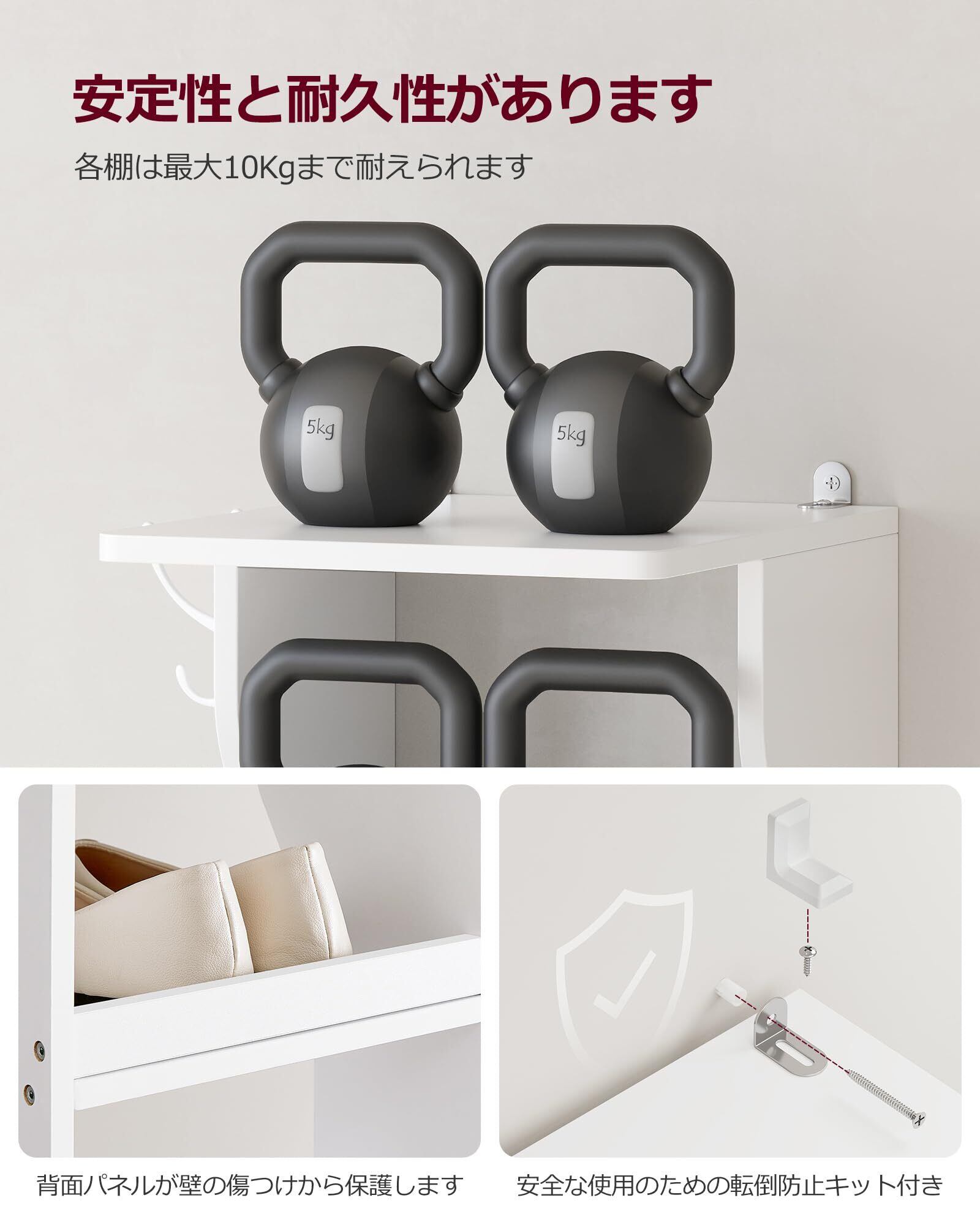 【背板が付き】背板が付いた7段のスリムなシューラック。背板は安定感を加え、壁を傷つけるのを防ぎます。さらに、安全性を確保するために、シューズラックを壁に固定するための転倒防止デバイスも付属しています。