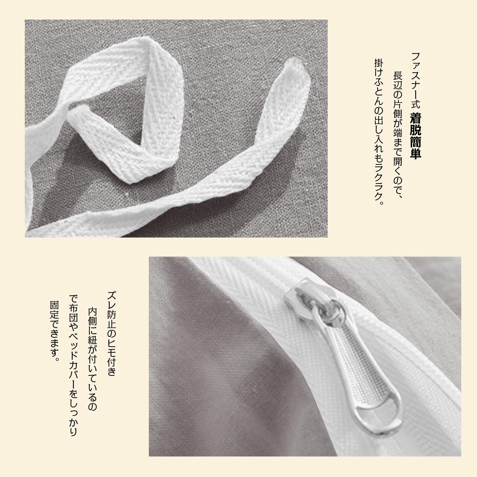 【全開ファスナー 取り付けラクラク】この布団カバーは使いやすさを追求した設計で、カバーの片側には全開ファスナーがあり、8ヶ所の紐で布団を固定できます。ぐーんと大きく開くので大変なふとんの出し入れがスムーズにできます。お手入れも簡単なので、忙しい主婦の強い味方です。一人暮らしの方や衣類のお手入れが難しい方におすすめです。