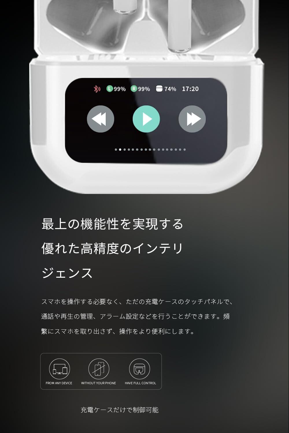 【ケースに1.47インチのタッチディスプレイが搭載】ワイヤレスイヤホンの最新「タッチディスプレイ搭載」モデルが登場しました。これまでスマートフォンのアプリやイヤホンからしか操作できなかった機能や設定の多くをケースのタッチディスプレイからも操作できるようになりました。再生や一時停止、音量、ANCノイズキャンセリング/外音取り込みモード、イコライザー、そのほかいくつかの機能や設定(イヤホンを探す機能、着信応答・拒否や簡易の通知機能など)を操作できます。