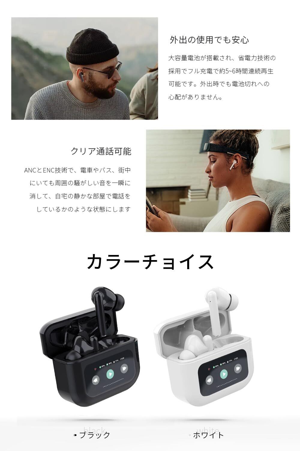 【2025新登場】明誠 ワイヤレスイヤホン Bluetooth 5.4 イヤホン タッチディスプレイ付き 液晶搭載ケース ANCノイズキャンセリング Hi-Fi音質 カナル型 左右分離型 片耳/両耳 タッチ操作 装着感快適 マイク内蔵 ハンズフリー通話(ホワイト) | hananoki